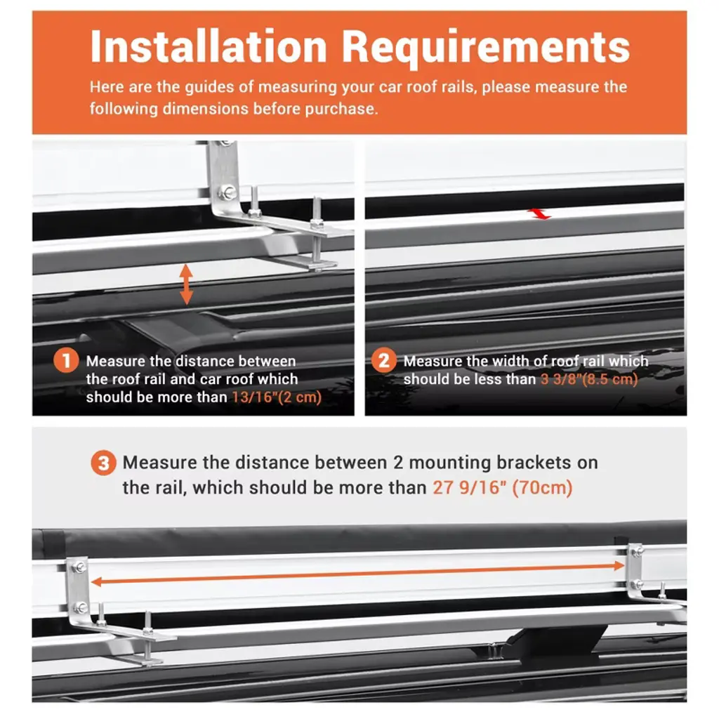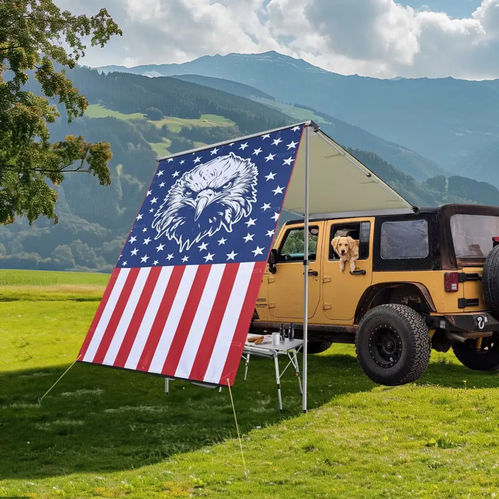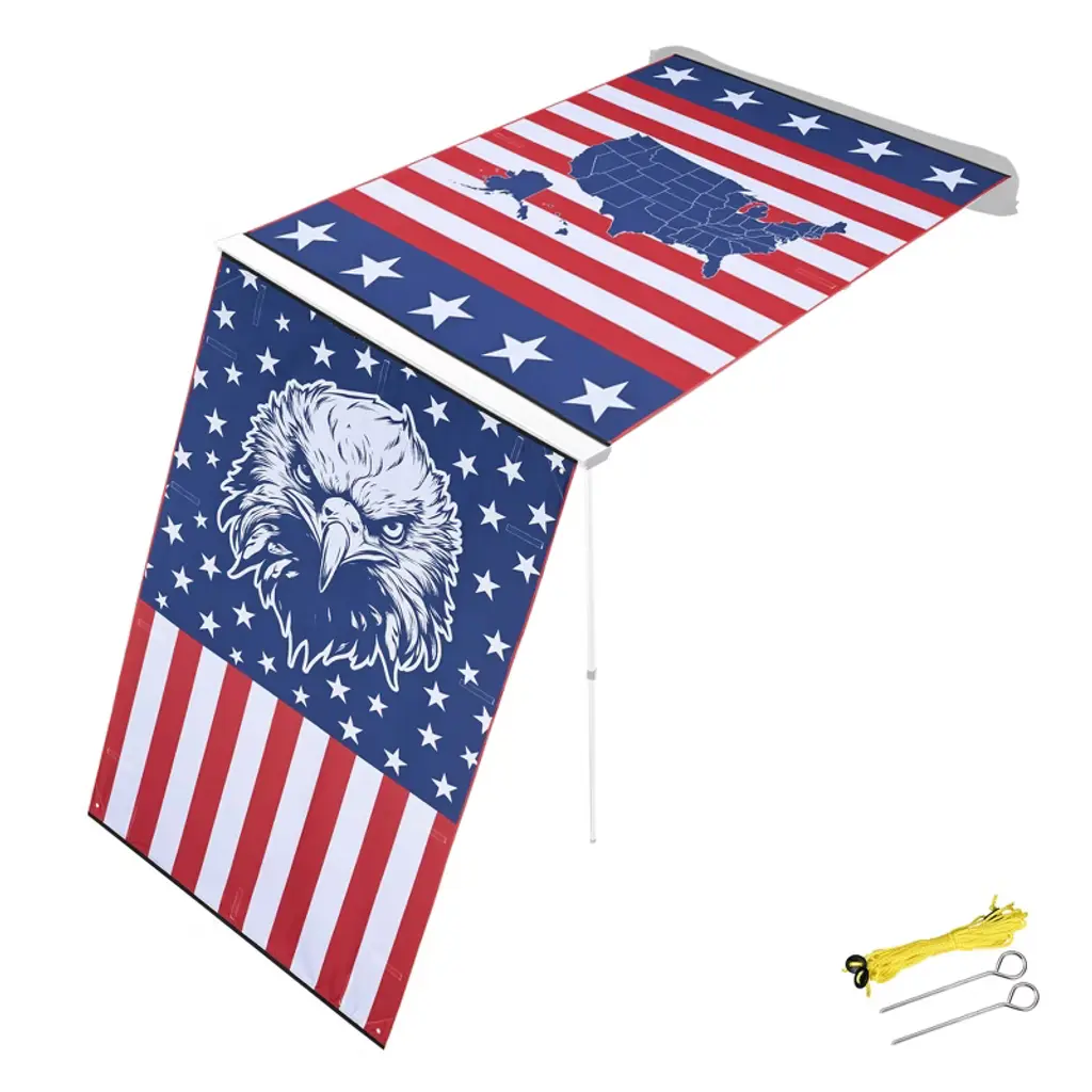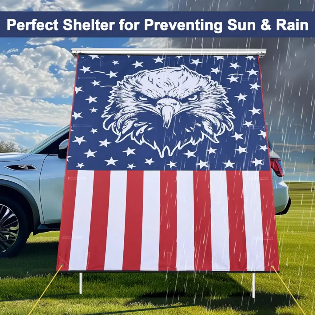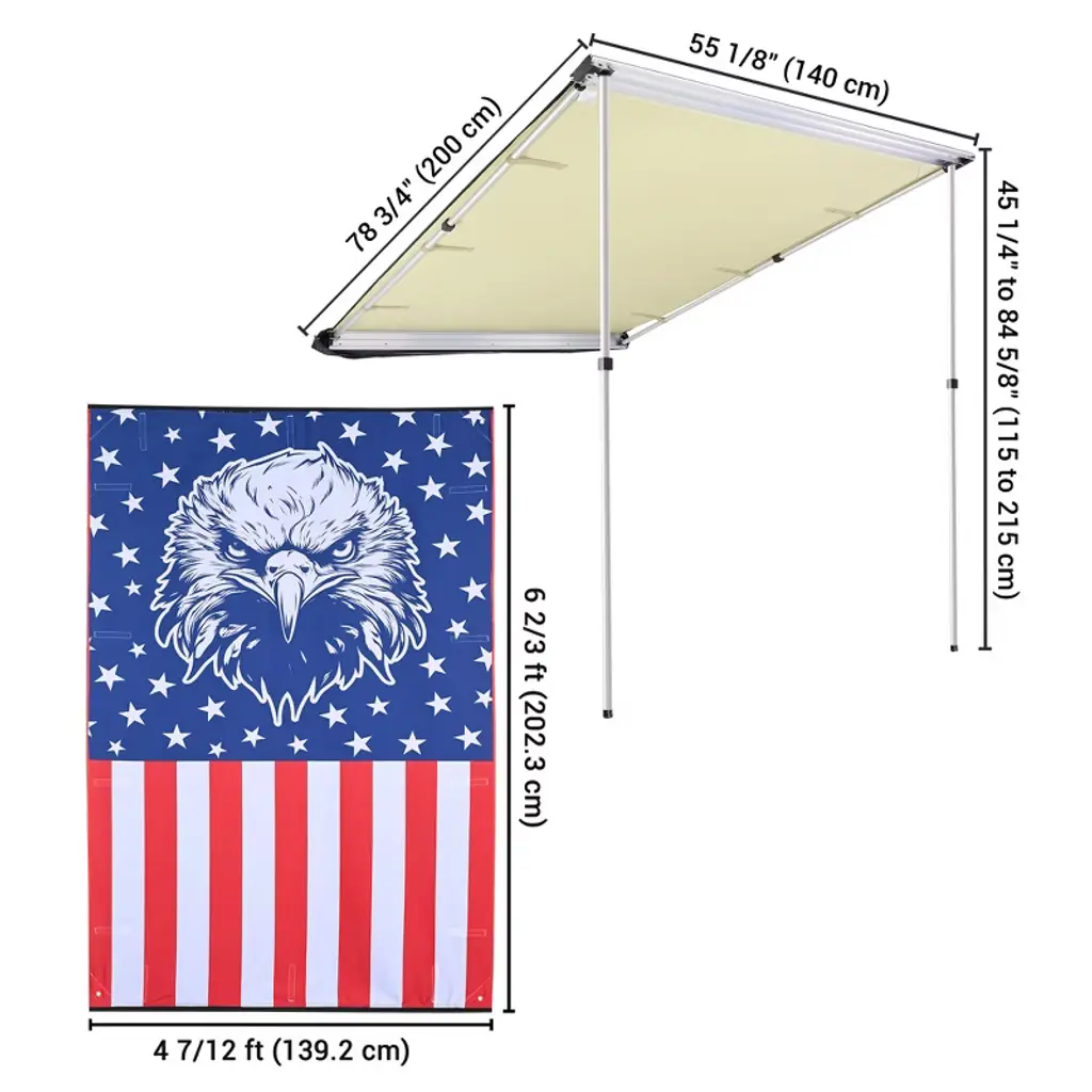 Features:- Carside Awning- Compatibility - 78 3/4" x 55 1/8" x 84 5/8" Car Side Awning offers 30 sq. ft area for outdoor activities; fits most vehicles with rooftop rails and compatible with rail width less than 3 3/8", distance between rail and roof more than 13/16" and the space of mounting 2 brackets should be more than 27 9/16" in length- Anti-UV & Water Resistant - Constructed of 420D oxford fabric with 2000mm PU coating and UV50+ protection, this awning gives you a cozy shelter to prevent harmful sun rays and drizzles- Easy Installation - Features telescoping poles with twist-lock design to quickly extend the poles- Portable & Easy to Store - Retractable design of the side poles & foldable cover allow for easy disassembly which can save space and allows you to store the awning- Sidewall- Show Your American Pride - 6 2/3 x 4 7/12 ft Extension Canopy for Car Side Awning features a vivid bald eagle with patriotic stars and stripes on the background, perfect decoration to demonstrate your patriotism for this country and boost the festive atmosphere for Independence Day, Memorial Day, Veterans Day, Patriots' Day, Emancipation Day- Durable & Anti-UV - Made of Oxford fabric with tear resistance and UV30+ protection, this extension canopy effectively keeps out of the hot sun from the side for protecting your delicate skin while enjoying outdoor campingSpecifications:- Carside Awning- Unfolded Overall Dimension(LxWxH) 78 3/4" x 55 1/8" x 84 5/8" (200 x 140 x 215 cm)- Adjustable Height 45 1/4" to 84 5/8" (115 to 215 cm)- Net Weight 15.4 Lbs (7 kg)- Sidewall- Overall Size(LxW) 6 2/3 ft x 4 7/12 ft (202.3 x 139.2 cm)- Net Weight 2.2 Lbs (1 kg)Package Contents:- 1x Carside Awning- 1x Sidewall- 2 Sets of Awning Mounting Brackets- 1 Set of Screws- 2x Wrenches- 4x Stakes- 4x Guy Ropes- 2x Manuals