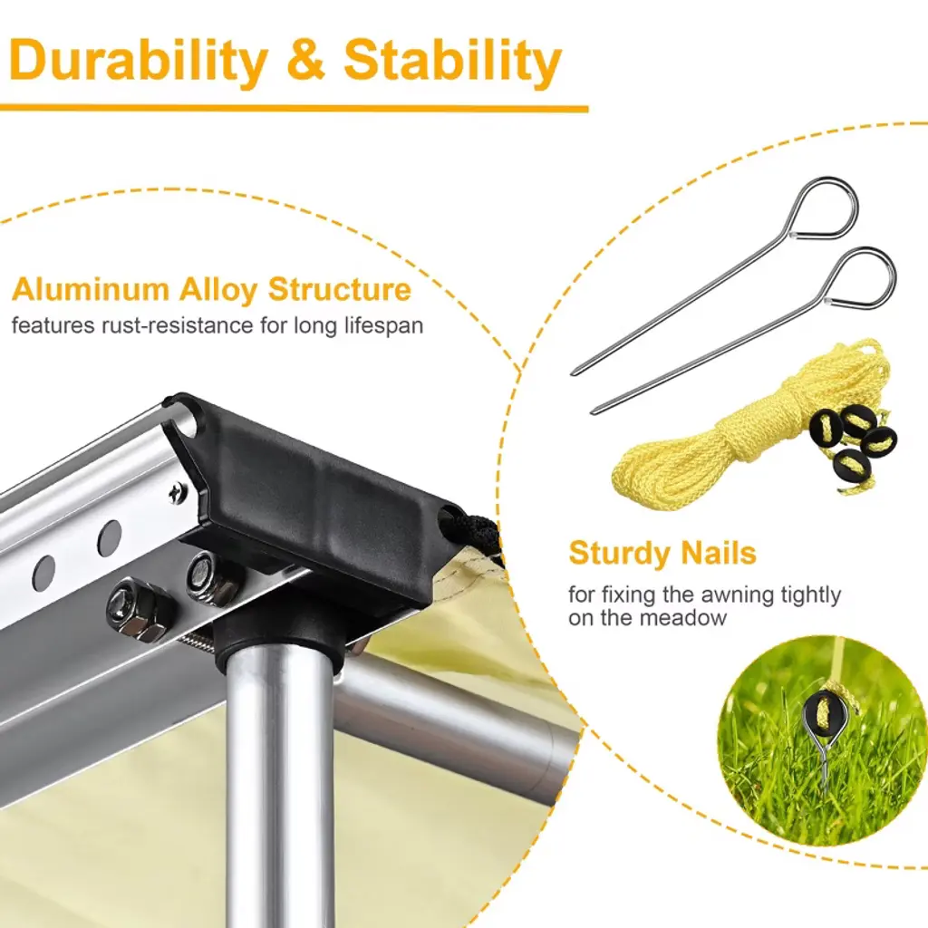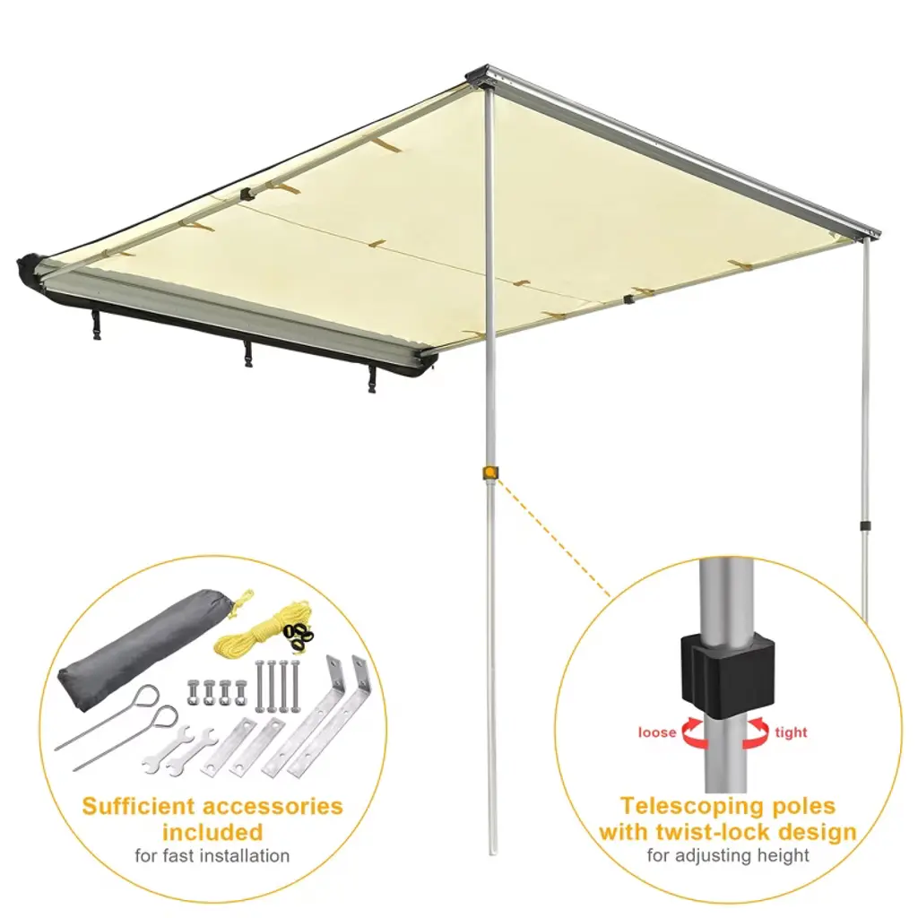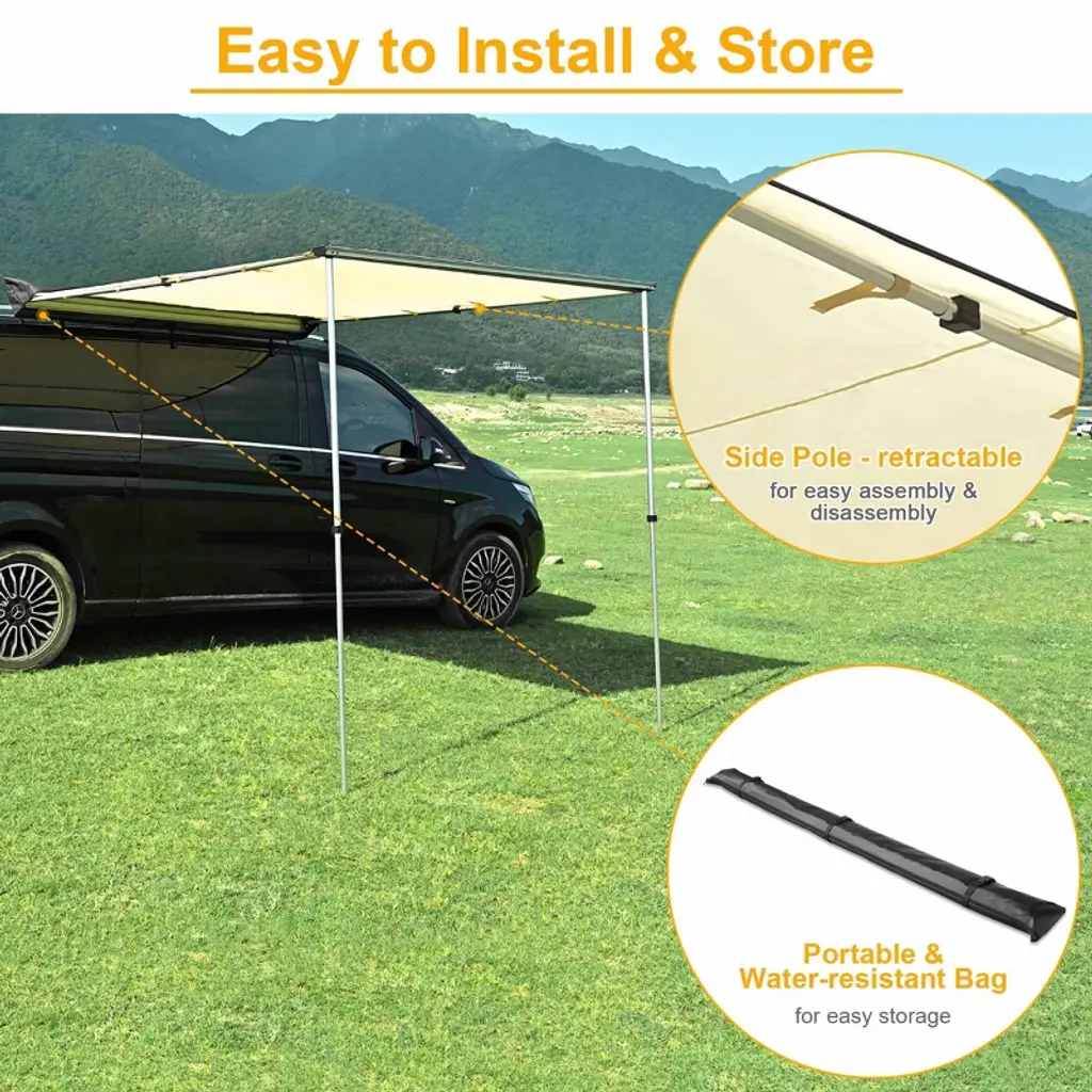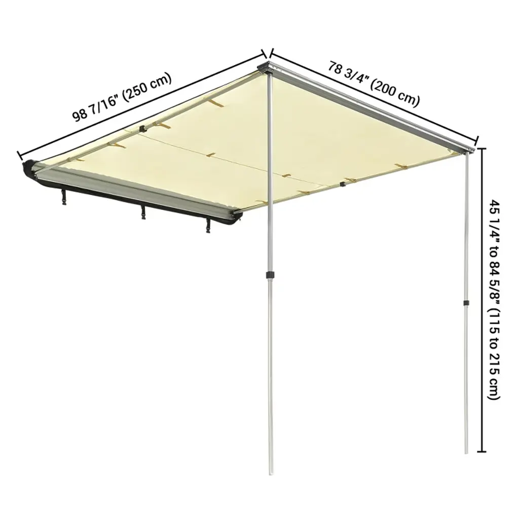 Features:- Compatibility - 98 7/16" x 78 3/4" x 84 5/8" Car Side Awning offers 54 sq.ft for outdoor activities; fits most vehicles with rooftop rails and compatible with rail width less than 3 3/8", distance between rail and roof more than 13/16" and the space of mounting 2 brackets should be more than 39 3/8" in length- Anti-UV & Water Resistant: Constructed of 420D oxford fabric with 2000mm PU coating and UV50+ protection - Easy Installation - Features telescoping poles with twist-lock design to quickly extend the poles;Built-in slot on the crossbar for securing additional side awning fabric or awning room easily- Portable & Easy to Store - Retractable design of the side poles & foldable cover allow for easy disassembly- Durable & Sturdy - Aluminum alloy structure with high-quality 304 stainless steel installation hardware for rust-resistance and durability; With the pegs and guy ropes for ensuring stability & sturdiness in different weathersSpecifications:- Unfolded Overall Dimension(LxWxH): 98 7/16" x 78 3/4" x 84 5/8" (250 x 200 x 215 cm)- Adjustable Height: 45 1/4" to 84 5/8" (115 to 215 cm) - Guy Rope Length: 118 1/8" (300 cm)- Distance Between Roof Rail and Car Roof: ≥ 13/16" (2 cm)-Compatible Rail Width: ≤ 3 3/8" (8.5 cm)-Space of Mounting 2 Brackets: ≥ 39 3/8" (100 cm)-Material: Aluminum Alloy Frame & 420D Oxford Cloth-Net Weight: 19.8 Lbs (9 kg)Package Contents:- 1x Awning- 2x Guy Ropes- 2x Sets of Mounting Brackets- 4x Pegs- 4x M8x25 Bolts- 4x M6x55 Bolts- 4x M6 Nyloc Nuts- 4x M8 Nyloc Nuts- 2x Wrenches- 2x Stakes- 1x ManualNote:- In order to prolong the service life of awning, it is highly recommended to detach the awning when there is a strong wind or under bad weather conditions and not to leave it outdoors for all night.