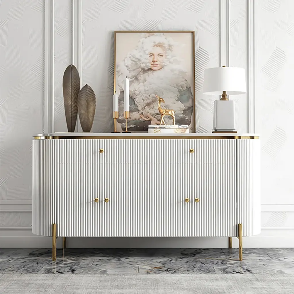 This sideboard is a perfect blend of simplicity and elegance, designed to enhance the aesthetic appeal of your living room, kitchen, or bedroom.The sideboard’s doors are designed with wavy stripes and uneven geometric lines, creating a three-dimensional effect that adds visual interest.The metal door handles and legs further enhance the cabinet’s texture and sophistication.The sideboard is constructed with a particleboard body and a high-quality MDF tabletop, ensuring a load-bearing capacity of 165 lbs.The doors, tabletop, and side panels have a smooth, painted finish, while other panels are covered with stickers for added durability. The sturdy metal legs provide excellent support and stability.With four doors and adjustable internal shelves, this sideboard offers ample storage space for plates, bowls, wine glasses, and small appliances.It can also be used in the bedroom to store clothes.The smooth finish makes it easy to clean, requiring just a damp cloth to wipe away stains.Full assembly is required, but the included detailed installation manual ensures a hassle-free setup process, taking approximately one hour to complete.This sideboard is not only functional but also adds a warm and romantic atmosphere to your home.