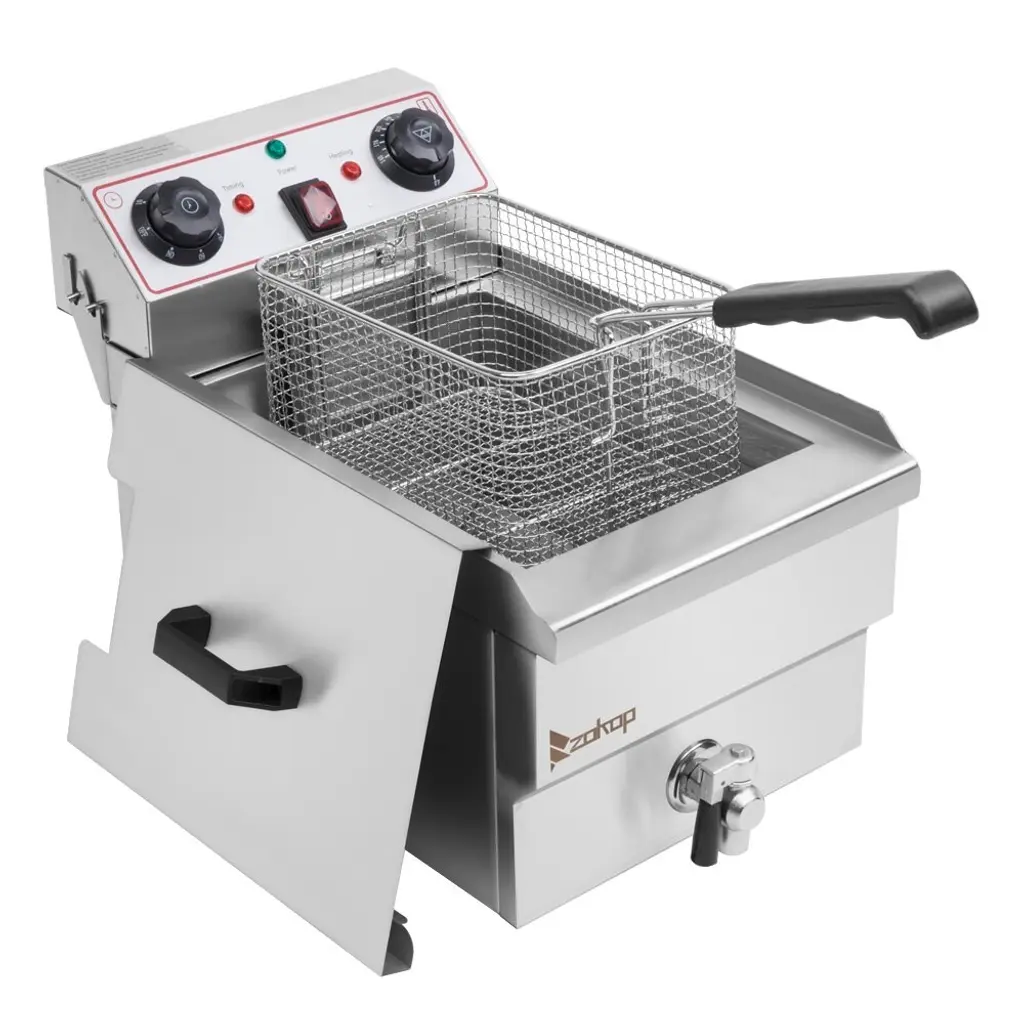 Introductions: This Stainless Steel Deep Fryer is durable for both commercial use and home. Perfect for commercial uses, such as restaurants, supermarkets, fast food stands, snack bars, parties, etc. Easy to operate and clean. Suitable for buffalo wings, chicken, dumplings, egg rolls, shrimp rolls, mozzarella sticks, jalapeno poppers, etc. Features: 1. Stainless steel construction and heating tube ensure longer life span 2. Thermostats for accurate temperature setting 3. 60-minute timers for controlling the cooking time 4. Heavy duty copper faucet style drains for edible oil releasing 5. Lid covers for preventing the boil oil splashing 6. Fryer baskets with plastic handles for safe operation 7. Rotating fryer heads for easy cleaning 8. ON / OFF switches and indicator lights to monitor the working procedure Specifications: 1. MAX Power: 1700W for Each Head 2. Tank Capacity: 12.5QT / 24.9QT 3. Voltage: 110V 4. Frequency: 60Hz 5. Temperature Range: 60°C - 200°C (140°F - 392°F) 6. Definite Time: 0-60minutes 7. Overall Dimension (L x W x H): (14.6 x 22 x 16.5)" / (26.4 x 22 x 16.5)" 8. Tank Dimension (L x W x H): (8.7 x 11.8 x 7)" / (22 x 30 x 18)cm (L x W x H) 9. Basket Dimension (L x W x H): (9.5 x 7.3 x 5.5)" / (24 x 18.5 x 14)cm (L x W x H) 10. Handle Length: 9”/ 23cm 11. Power Cord Length: 55" / 1.4m 12. Weight: 18lb / 32.2lb 13. Brand: ZOKOP Package Includes: 1 x Single/Double Tank Deep Fryer 1 x Stainless Steel Basket 1 x Handle 1 x Stainless Steel Lid 1 x Stainless Steel Residue Plate 1 x Installation Package (4*Feet 1*Cover Handle) 1 x Manual