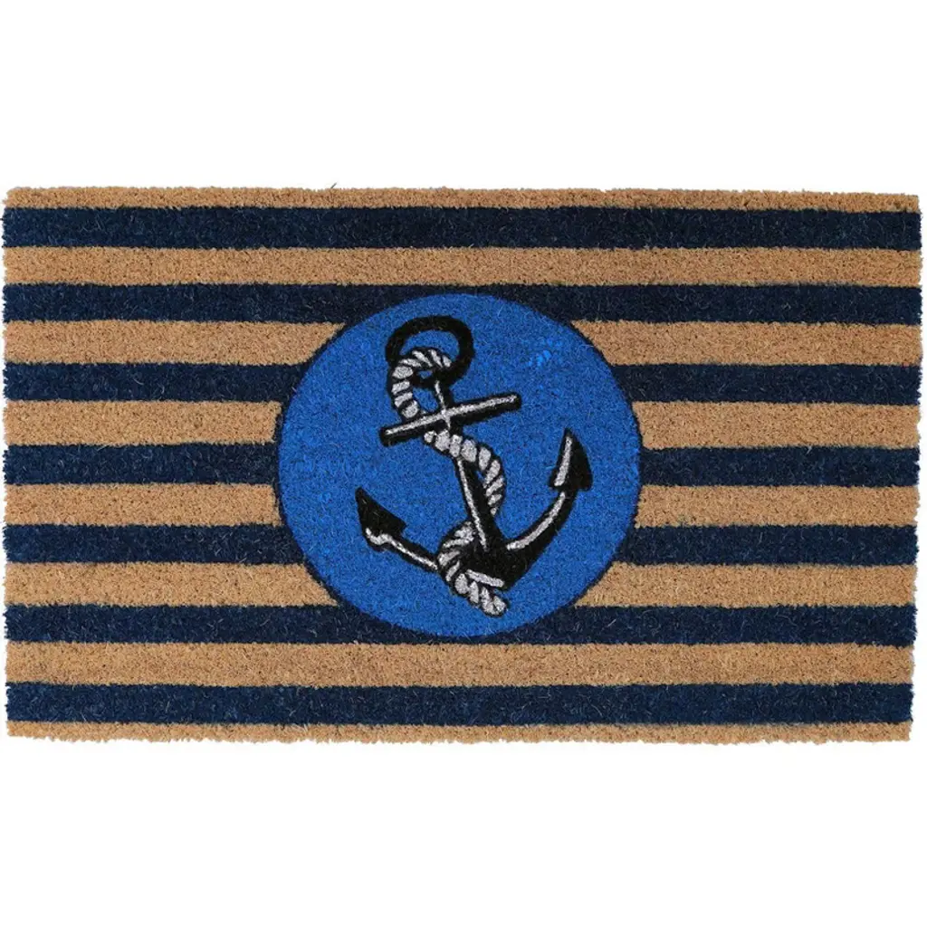 Bring traditional nautical design to your doorstep with “Blue Anchor.” This Entryways Sweet Home Collection doormat measures 17" by 28" and is 1/2" thick. It's crafted from the highest quality all-natural coir and hand-stenciled with eco-friendly dyes for long-lasting vibrance. This mat also has a PVC backing. Stain and fade resistant topside for long-lasting use both inside and outside your home. Perfect for daily use in high traffic areas.