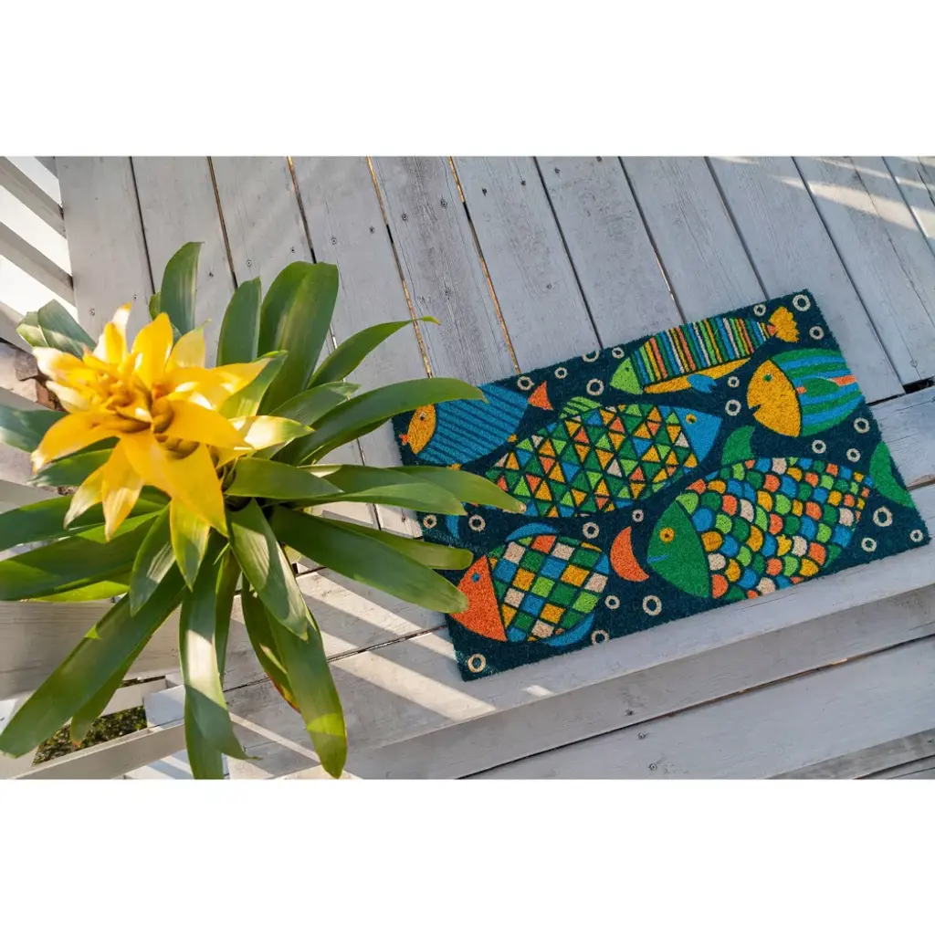 Brightly patterned fish float happily across this upbeat doormat, lending color and personality to your door décor. Long-lasting mat is crafted of eco-friendly dyes on durable, 100% natural coconut coir with PVC backing. Coir’s excellent scraping qualities ensure that outside dirt stays at the door. Keep your floor clean while adding color and style to your doorstep with door and floor mats by artists from Entryways!