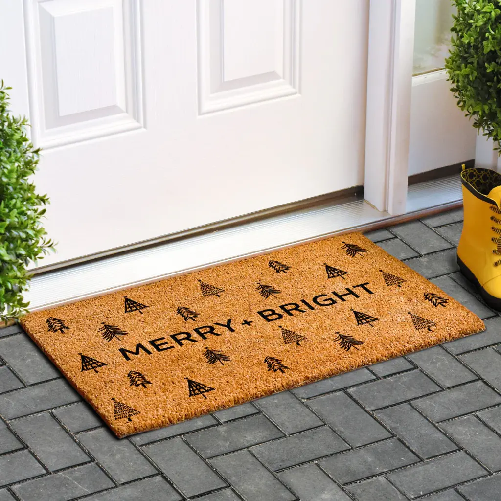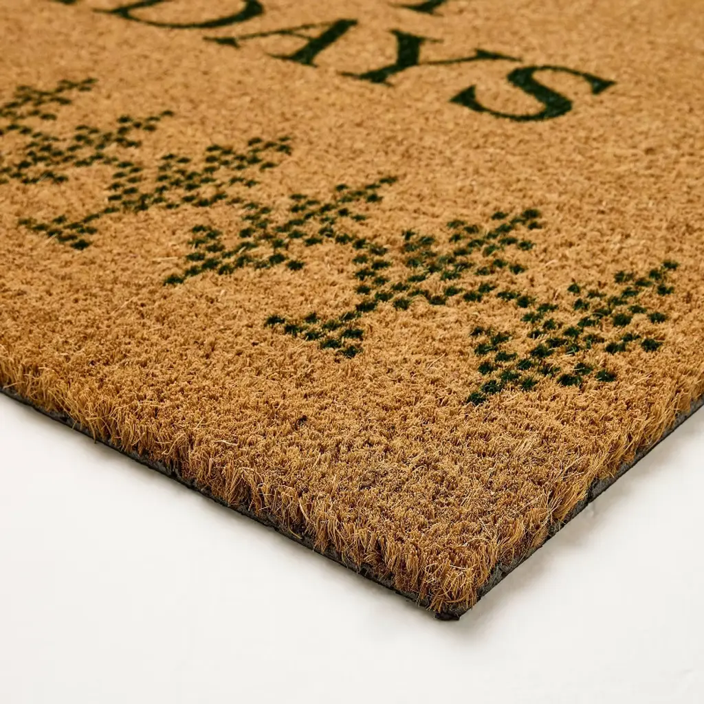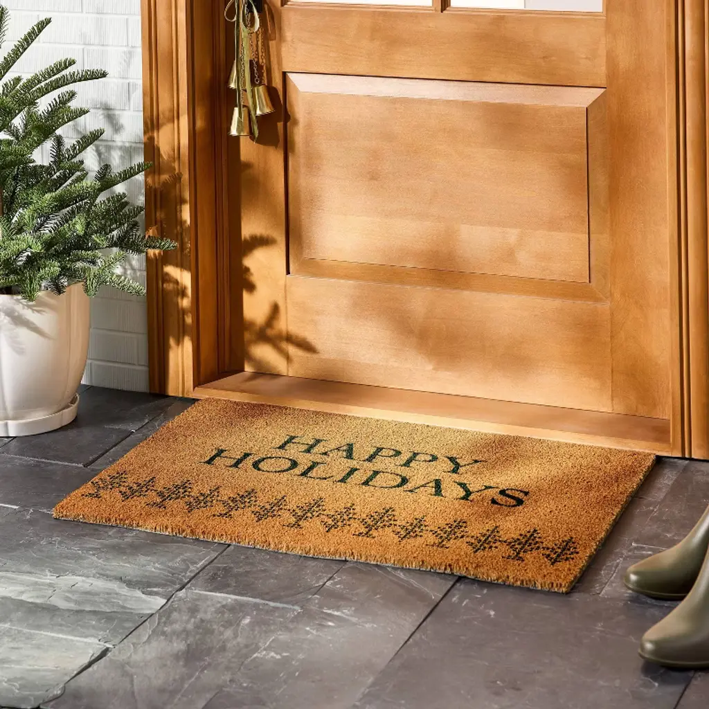 Create a joyful seasonal entryway look with this Happy Holidays Coir Doormat from Hearth & Hand™ with Magnolia. The medium-pile doormat is made of 100% coir material that effectively removes dirt and debris from shoes right at your doorstep, and it comes with a latex backing to keep it in place. This rectangular outdoor doormat features the bold green-lettered "Happy Holidays" text with a line of green pixelated-like trees underneath against a warm tan-color background, creating the perfect festive foundation to add welcoming holiday spirit to your front door.Hearth & Hand™ with Magnolia: Gather • Create • Enjoy