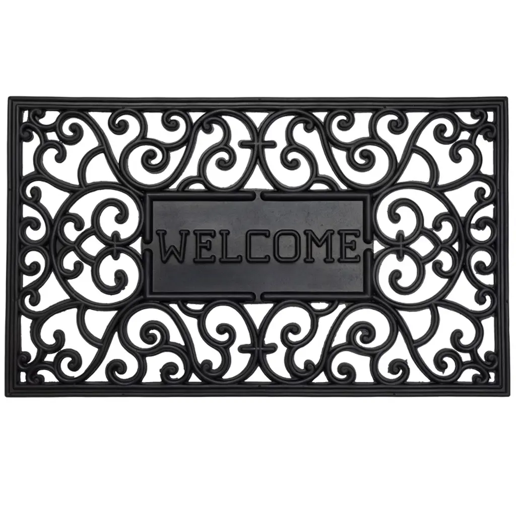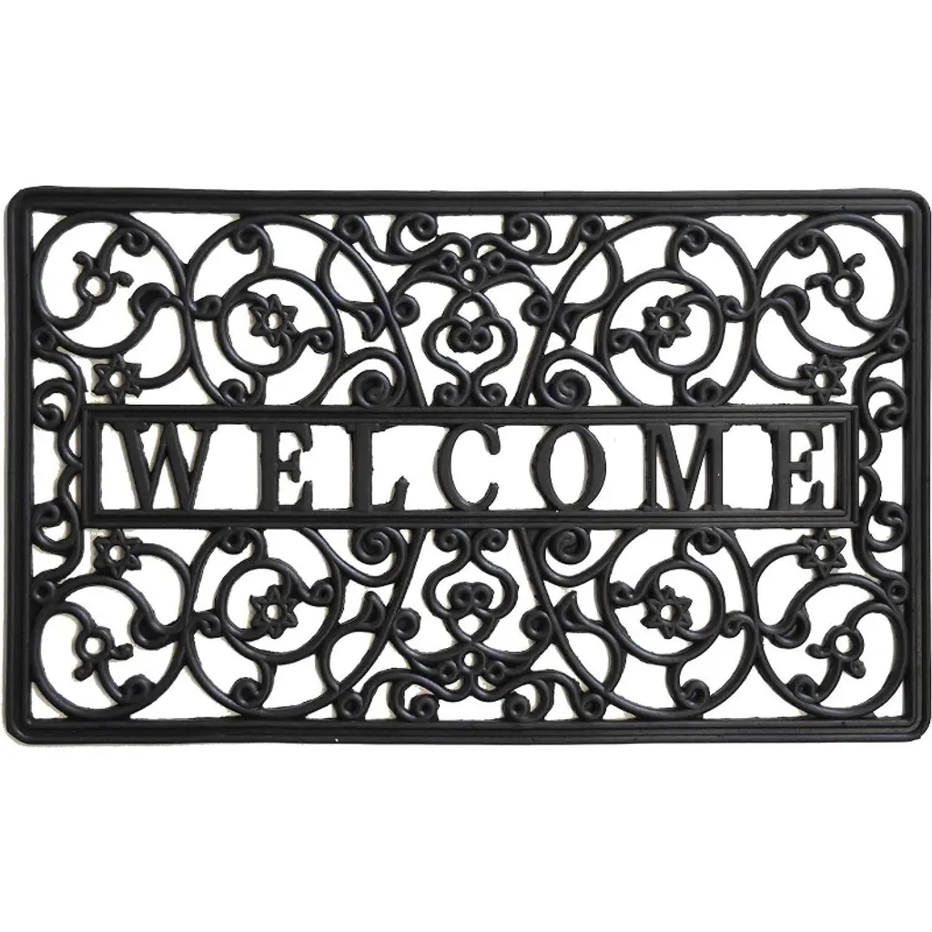 Compliment your entryway with this beautiful "Welcome" door mat! Color(s): black Non-skid durable backing which helps to keep your door mat securely in place For indoor or outdoor use Care instructions: rinse with hose and air dry Dimensions: 17.75"H x 29.5"W x .4"D Material(s): rubber