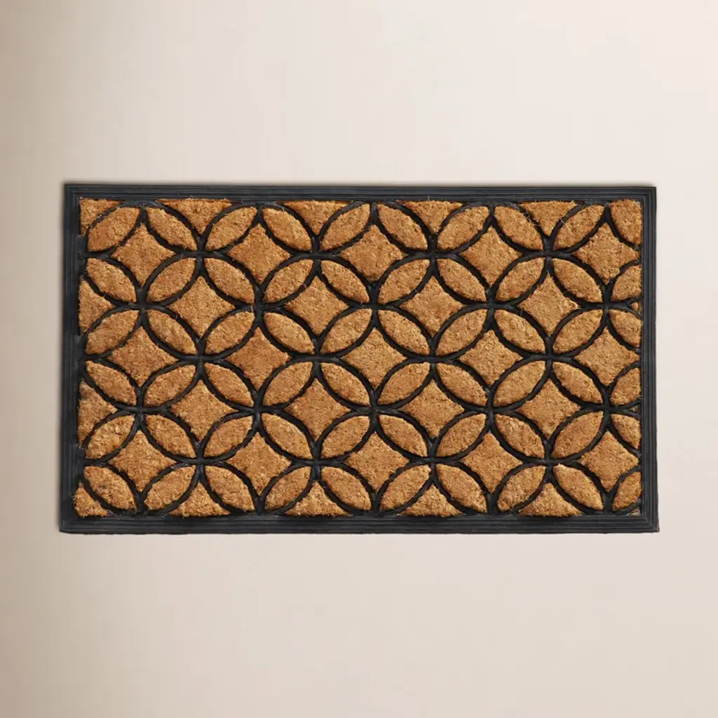 Compliment your entryway with this door mat accented with a decorative circle and diamond pattern Color(s): black natural Non-skid durable backing which helps to keep your door mat securely in place For indoor or outdoor use Care instructions: rinse with hose and air dry Dimensions: 18"H x 30"W x .75"D Material(s): rubber/natural coir fibers