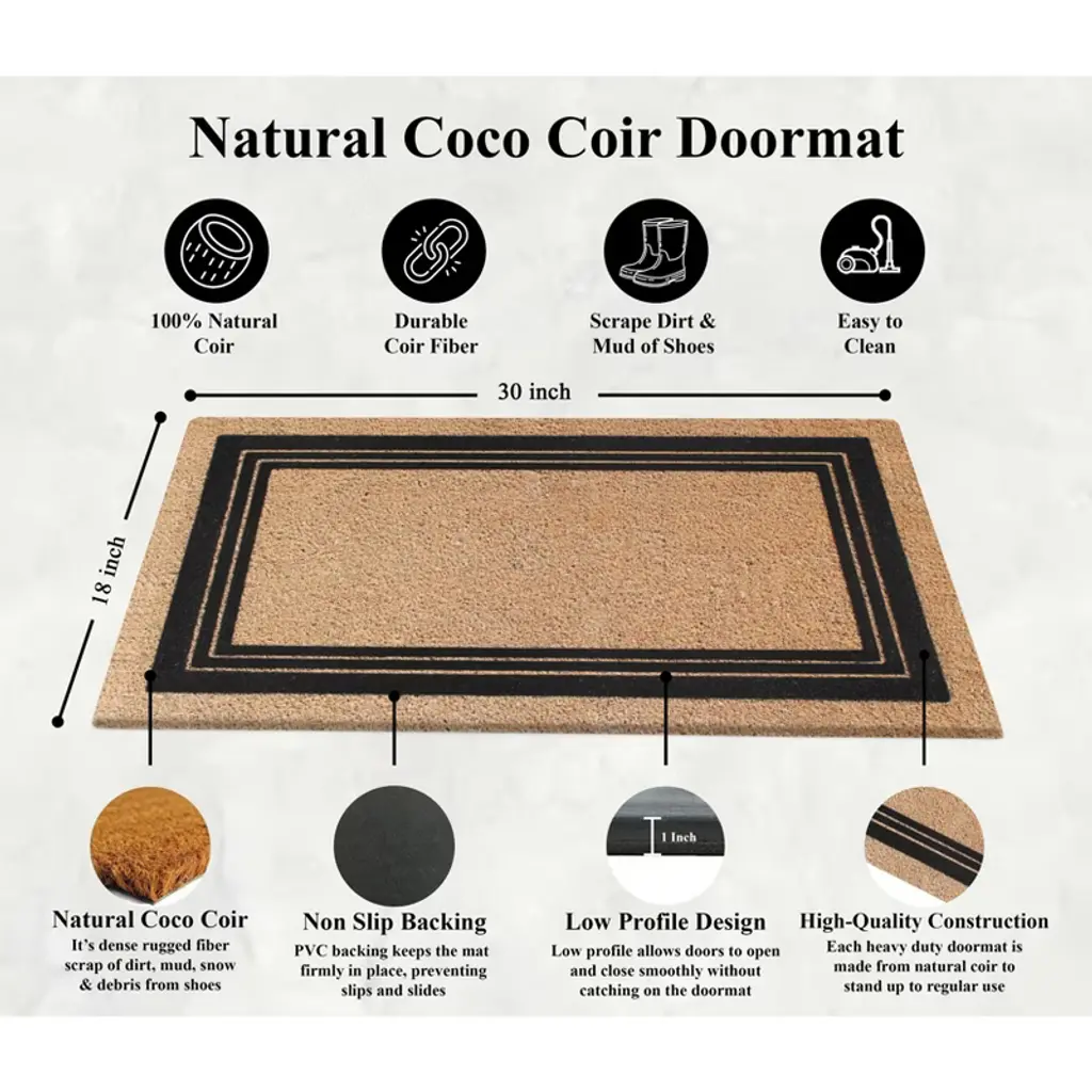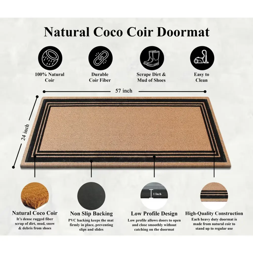 Add an excellent decorative accent to your doorway or entrance with this X-Large doormat. this mat helps remove dirt, debris and moisture from the soles of your shoes. Flexible coir bristles are robust and durable for a good scrub result. This mat provides exceptional brushing action on footwear with excellent water absorption. This doormat is X Large and covers the double door entrance perfectly. More than a decorative enhancement this rubber & coir doormat is made With a heavy rubber backing that anchors it in place while you brush dirt & debris from shoes & boots. The tufted coco-fiber facilitates scrubbing soles clean.