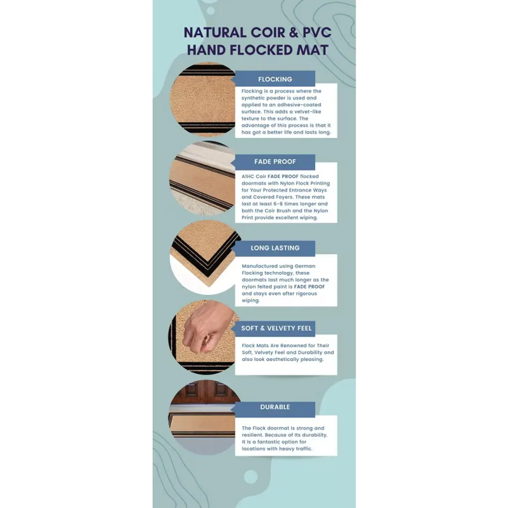 Add an excellent decorative accent to your doorway or entrance with this X-Large doormat. this mat helps remove dirt, debris and moisture from the soles of your shoes. Flexible coir bristles are robust and durable for a good scrub result. This mat provides exceptional brushing action on footwear with excellent water absorption. This doormat is X Large and covers the double door entrance perfectly. More than a decorative enhancement this rubber & coir doormat is made With a heavy rubber backing that anchors it in place while you brush dirt & debris from shoes & boots. The tufted coco-fiber facilitates scrubbing soles clean.