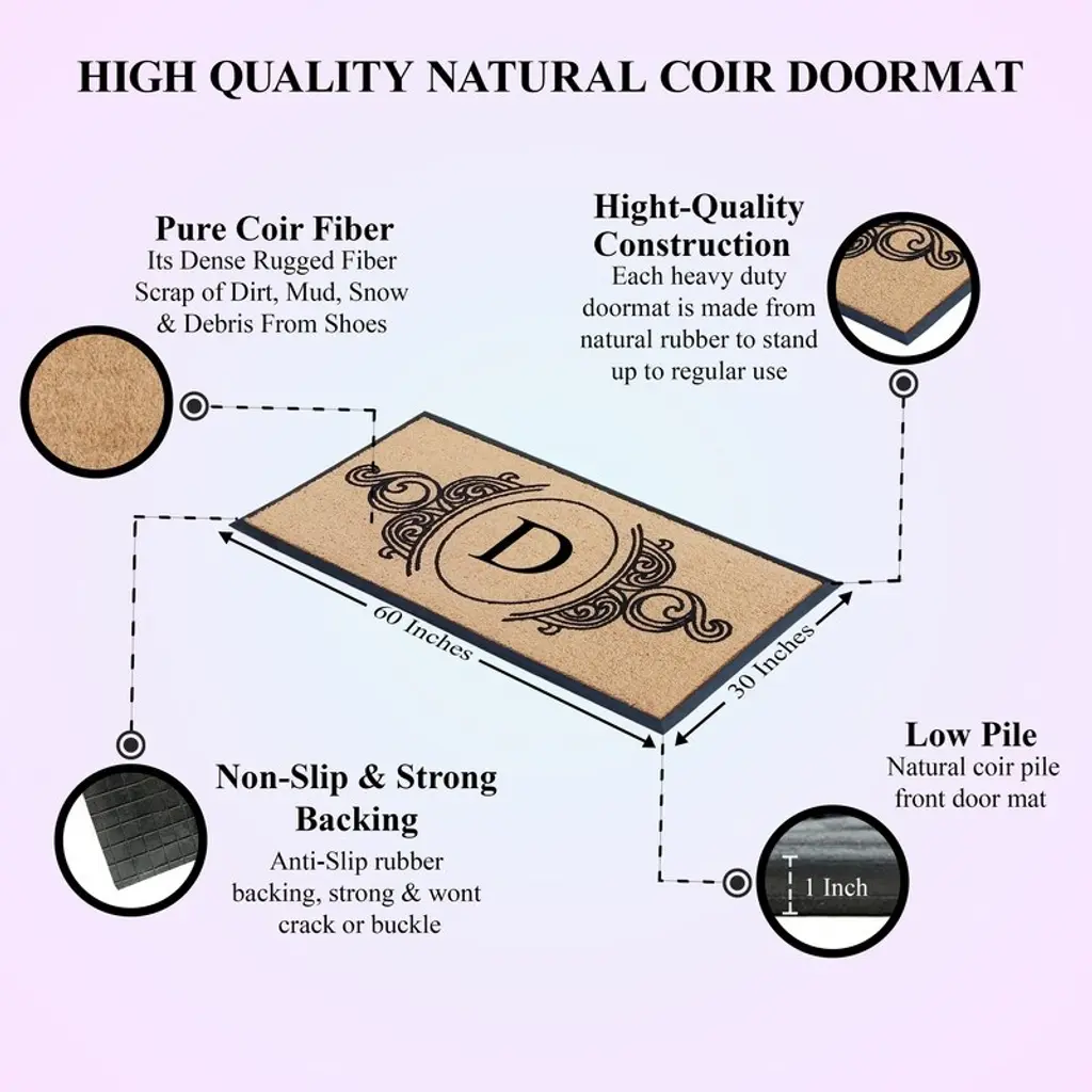 More than a decorative enhancement this rubber & coir molded monogrammed doormat is made with a heavy rubber backing that anchors it in place while you brush dirt & debris from shoes & boots. The tufted coco-fiber facilitates scrubbing soles clean. Keeps your floor clean when you decorate your entryway with this beautiful doormat, which includes a sturdy rubber backing to help in keep the mat in place & prevent slips. The attractive design of this Coir Door Mat creates a welcoming entrance for your guests & the durable coir material holds up to lots of foot traffic. This Welcome Mat Recommended for outdoor use in covered areas. Vacuum or shake the mat regularly for longer life.