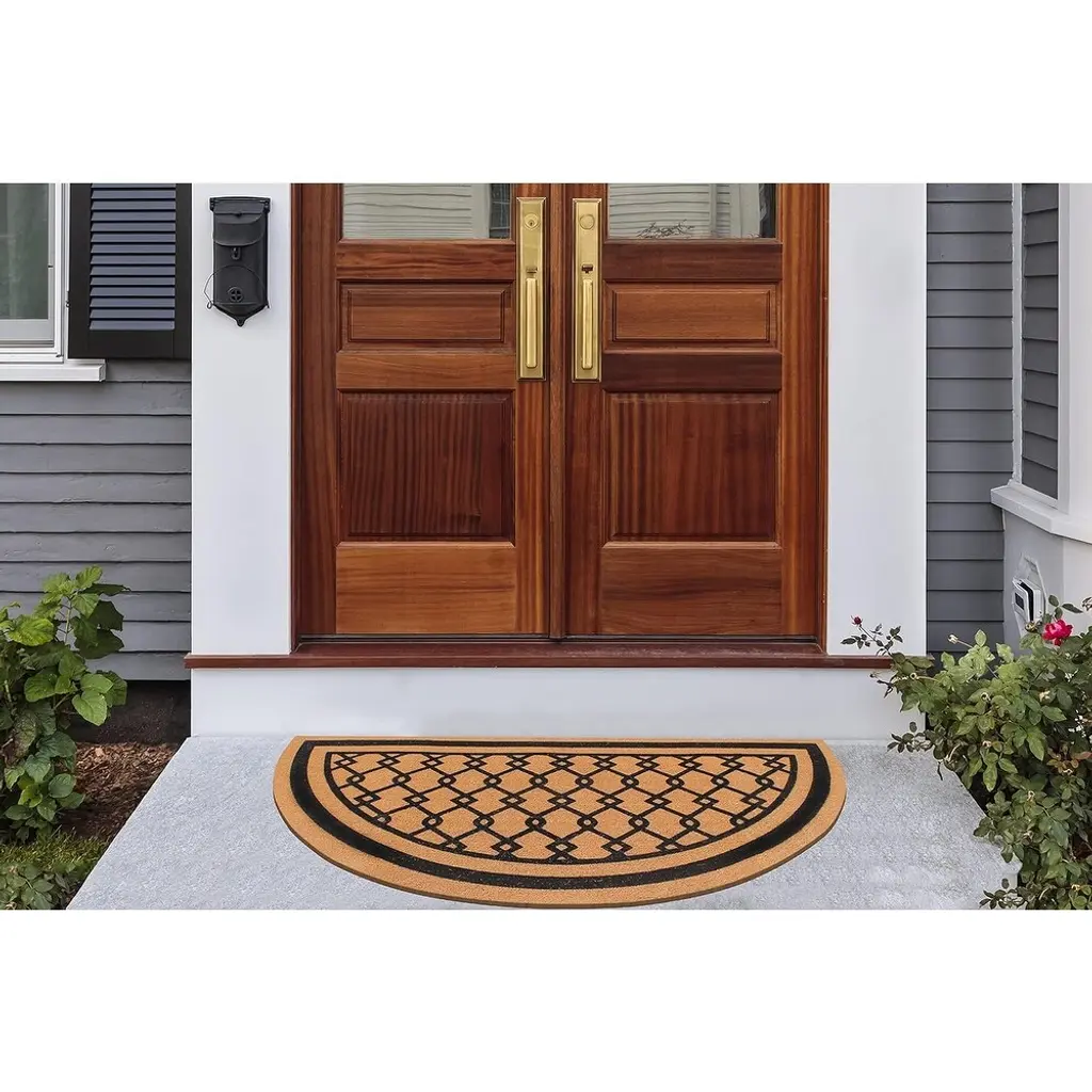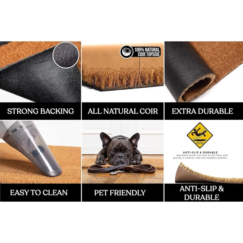 Add an excellent decorative accent to your doorway or entrance with this X-Large doormat. this mat helps remove dirt, debris and moisture from the soles of your shoes. Flexible coir bristles are robust and durable for a good scrub result. This mat provides exceptional brushing action on footwear with excellent water absorption. This doormat is X Large and covers the double door entrance perfectly.