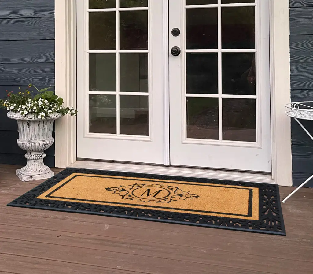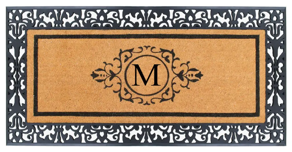 Keeps your floor clean when you decorate your entryway with this contemporary doormat, which includes a sturdy rubber backing to help in keep the rug in place & prevent slips. The attractive design of this coir and rubber Doormat creates a welcoming entrance for your guests & the durable coir material holds up to lots of foot traffic. Recommended for outdoor use in covered areas. Vacuum or shake the mat regularly for longer life.>NEWLY DEVELOPED RUBBER AND COIR MOLDED MONOGRAMMED DOOR MAT: This is a completely newly designed door mat, suitable for both single and double doors. The large size monogrammed door mat is made of Natural Coir fiber and high-quality rubber. This Rubber coir door mat has a large coir area to clean and wipe your shoes which keeps your house clean.>NATURAL COIR PILE MONOGRAMMED FRONT DOOR MAT: This Door mat is made from 100% natural coir fibers which are one of the strongest fibers and they naturally trap dust and other particles. The biodegradable coir fiber material is environmentally friendly and compostable.>HEAVY DOOR MAT WITH RUBBER BACKING: This Doormat is heavy weight with a solid rubber backing. This door mat doesn"™t get easily blown away by wind and anchors to the ground to prevent slipping.>ATTRACTIVE DESIGN AND ANTI SHED TREATED FRONT DOOR MAT: This is a personalized designed door mat and every door mat is Hand monogrammed individually in the USA. The coir portion of this door mat is treated with Anti Shed dyes to minimize shedding.>RECOMMENDED TO BE USED OUTSIDE UNDER COVERED AREAS ONLY: Coconut coir is naturally resistant to unwanted substance, making this the most low-maintenance door mat possible. Direct exposure to Rain and sunlight is not recommended.>UNIQUE GIFT IDEA THEY WON"™T FORGET: Looking for birthday gifts for mom, housewarming gifts for new homeowners, wedding gifts for bride and groom, or hostess gifts for women who have everything? Our large size monogrammed front door mat is sure to please everyone. Our unique & beautiful hand monogrammed door mat makes a thoughtful, functional, and versatile gift that will last for years!