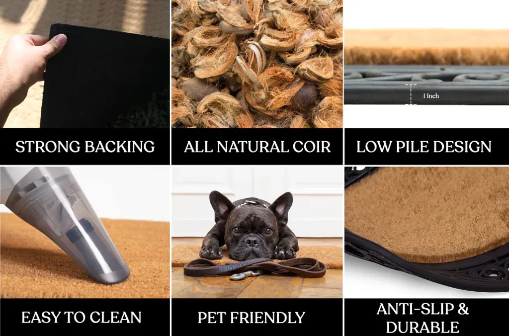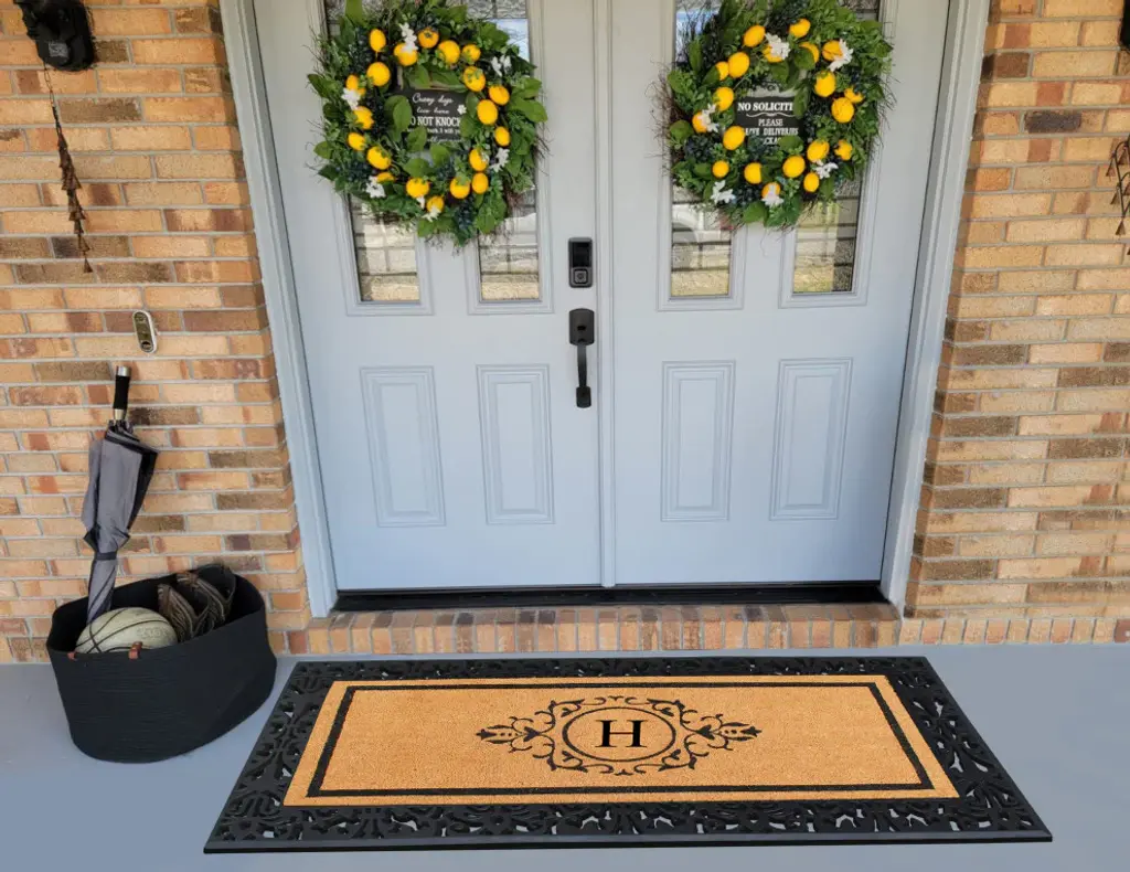 Keeps your floor clean when you decorate your entryway with this contemporary doormat, which includes a sturdy rubber backing to help in keep the rug in place & prevent slips. The attractive design of this coir and rubber Doormat creates a welcoming entrance for your guests & the durable coir material holds up to lots of foot traffic. Recommended for outdoor use in covered areas. Vacuum or shake the mat regularly for longer life.>NEWLY DEVELOPED RUBBER AND COIR MOLDED MONOGRAMMED DOOR MAT: This is a completely newly designed door mat, suitable for both single and double doors. The large size monogrammed door mat is made of Natural Coir fiber and high-quality rubber. This Rubber coir door mat has a large coir area to clean and wipe your shoes which keeps your house clean.>NATURAL COIR PILE MONOGRAMMED FRONT DOOR MAT: This Door mat is made from 100% natural coir fibers which are one of the strongest fibers and they naturally trap dust and other particles. The biodegradable coir fiber material is environmentally friendly and compostable.>HEAVY DOOR MAT WITH RUBBER BACKING: This Doormat is heavy weight with a solid rubber backing. This door mat doesn"™t get easily blown away by wind and anchors to the ground to prevent slipping.>ATTRACTIVE DESIGN AND ANTI SHED TREATED FRONT DOOR MAT: This is a personalized designed door mat and every door mat is Hand monogrammed individually in the USA. The coir portion of this door mat is treated with Anti Shed dyes to minimize shedding.>RECOMMENDED TO BE USED OUTSIDE UNDER COVERED AREAS ONLY: Coconut coir is naturally resistant to unwanted substance, making this the most low-maintenance door mat possible. Direct exposure to Rain and sunlight is not recommended.>UNIQUE GIFT IDEA THEY WON"™T FORGET: Looking for birthday gifts for mom, housewarming gifts for new homeowners, wedding gifts for bride and groom, or hostess gifts for women who have everything? Our large size monogrammed front door mat is sure to please everyone. Our unique & beautiful hand monogrammed door mat makes a thoughtful, functional, and versatile gift that will last for years!