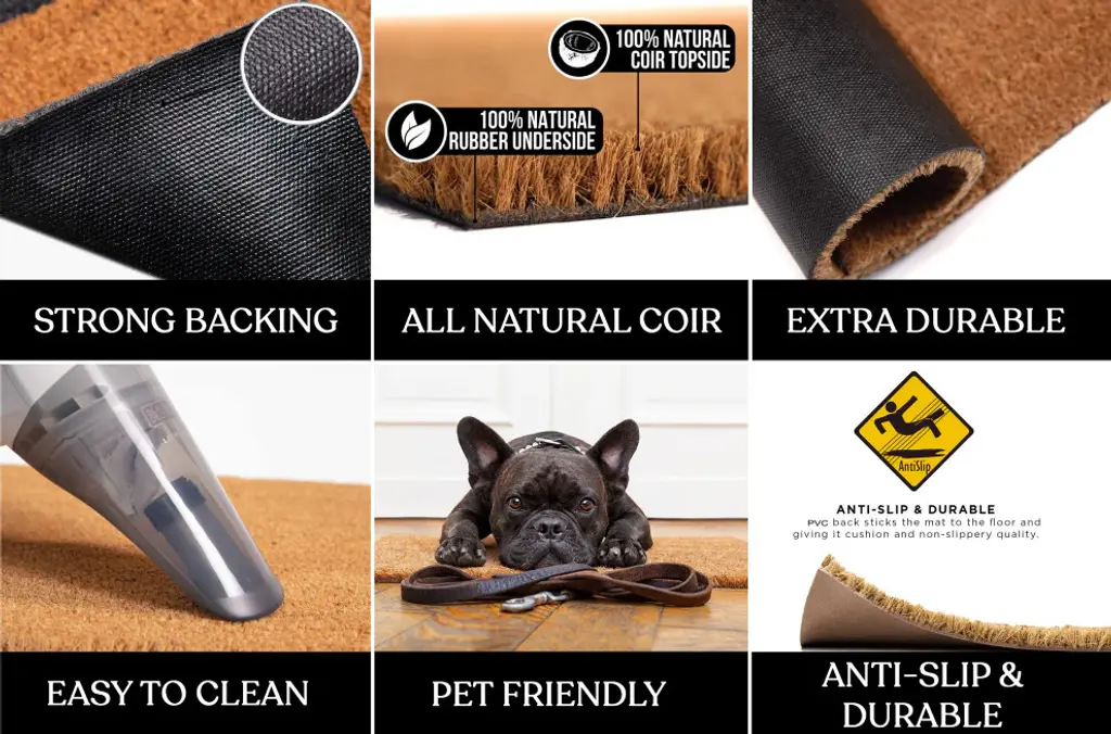 Decorative mat is great for any season & beautifies your doorstep. Durable & dirt resistant, its beautiful pattern will make a great first impression on any guest. Made from 100% natural coir fiber this durable mat provides exceptional brushing action on footwear with excellent water absorption.>COCONUT COIR: Our welcome outdoor doormat is made of 100% pure coconut coir, which is one of the strongest natural fibers in the world. The material easily captures moisture, dirt, and other Particles, and acts as a natural bug repellent. Shedding in Natural in coir fibers. Use in covered outdoor areas or in front doors.>ATTRACTIVE DESIGN: The material has a heavy-duty 0. 75"� thick pile, and is made so there are no patches where you can see through to the PVC mat below. With coconut coir doormats, some shedding is inevitable, but by using Anti Shedding dyes we have reduced it to the minimum.>LOW MAINTENANCE: Coconut coir is naturally resistant to bacteria and fungi, making this the most low-maintenance doormat possible. It is also water-resistant, and will dry quickly so you won"™t need to worry about mildew or molds. Simply shake it out or vacuum it once in a while, and let the coir do the rest.>OUTDOOR USE IN COVERED AREAS: The rug is designed specifically for outdoor use in covered areas, making it ideal for entryway in your home. Built to last, the durable material will withstand any weather condition.>GREAT GIFT: Easy to use the coco coir doormat is a great low-maintenance gift.>Only for use in covered outdoor areas. Do not expose directly to sunlight or rain.