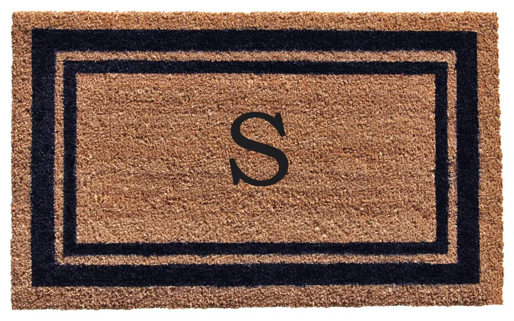 Brighten your home entry with this beautiful monogrammed doormat. Made of natural coir, a durable fiber that scrapes shoe bottoms clean, this doormat has a prominent double border that encases your initial and is vinyl backed to help prevent movement when walked on. Weather tolerant and colorfast, coir doormats absorb moisture, retain their shape and do not mat down regardless of the traffic. Vacuum, shake or lightly hose clean and allow to dry.