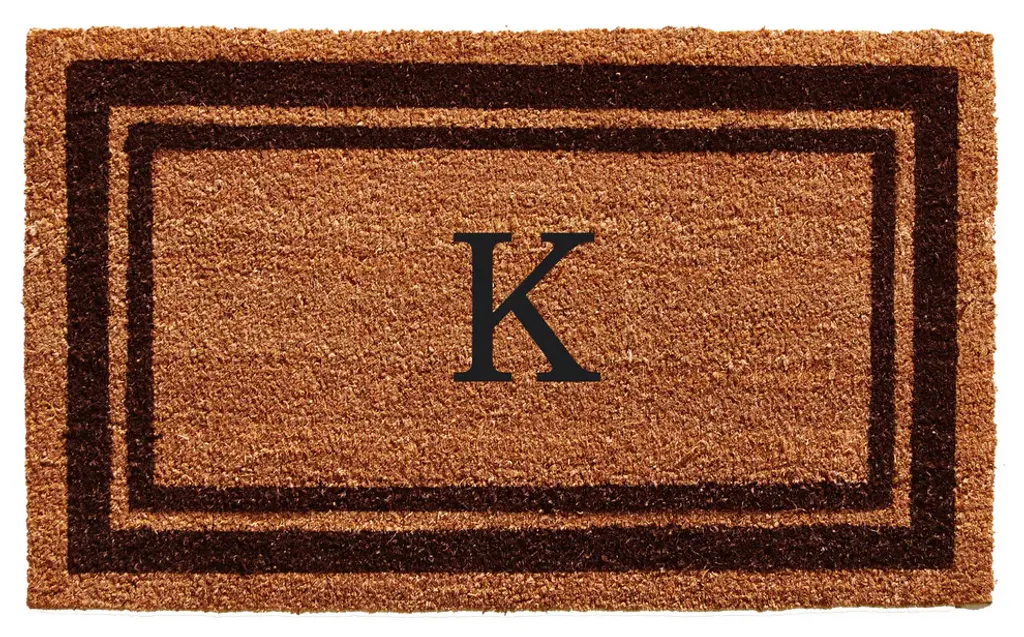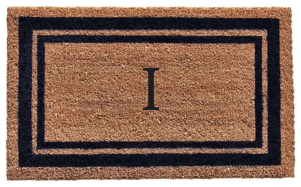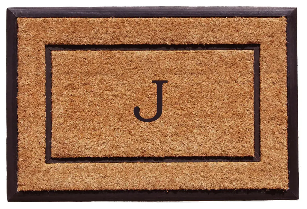 Brighten your home entry with this beautiful monogrammed doormat. Made of natural coir, a durable fiber that scrapes shoe bottoms clean, this doormat has a prominent double border that encases your initial and is vinyl backed to help prevent movement when walked on. Weather tolerant and colorfast, coir doormats absorb moisture, retain their shape and do not mat down regardless of the traffic. Vacuum, shake or lightly hose clean and allow to dry.