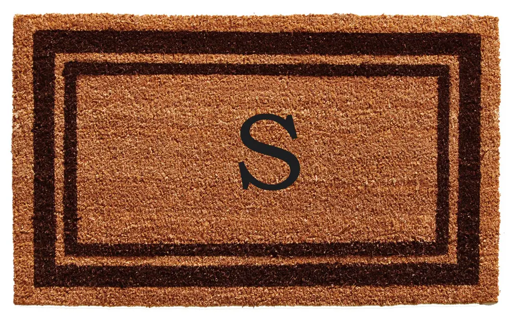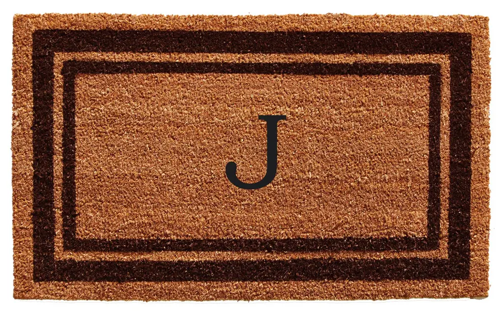 Brighten your entry with this beautiful over-sized monogrammed doormat. Made of natural coir, a durable fiber that scrapes shoe bottoms clean, this doormat has a prominent double border that encases your initial and is vinyl backed to help prevent movement when walked on. Weather tolerant and colorfast, coir doormats absorb moisture, retain their shape and do not mat down regardless of the traffic. Vacuum, shake or lightly hose clean and allow to dry.