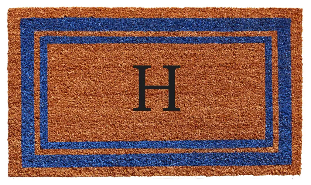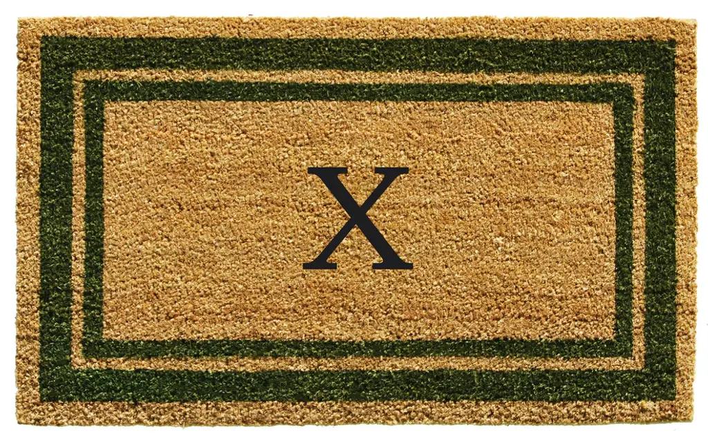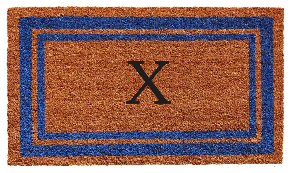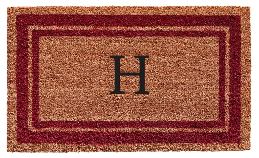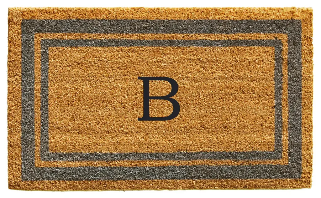 Brighten your entry with this beautiful over-sized monogrammed doormat. Made of natural coir, a durable fiber that scrapes shoe bottoms clean, this doormat has a prominent double border that encases your initial and is vinyl backed to help prevent movement when walked on. Weather tolerant and colorfast, coir doormats absorb moisture, retain their shape and do not mat down regardless of the traffic. Vacuum, shake or lightly hose clean and allow to dry.