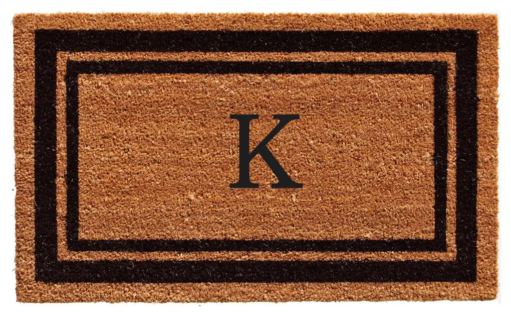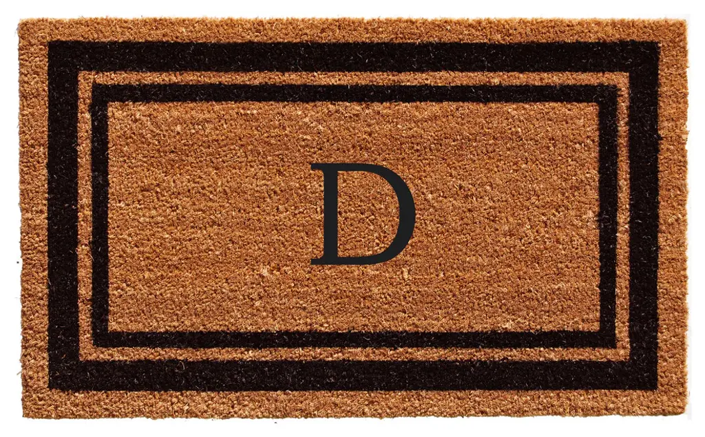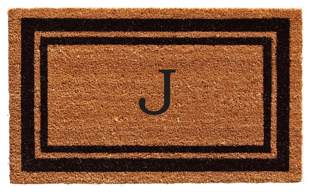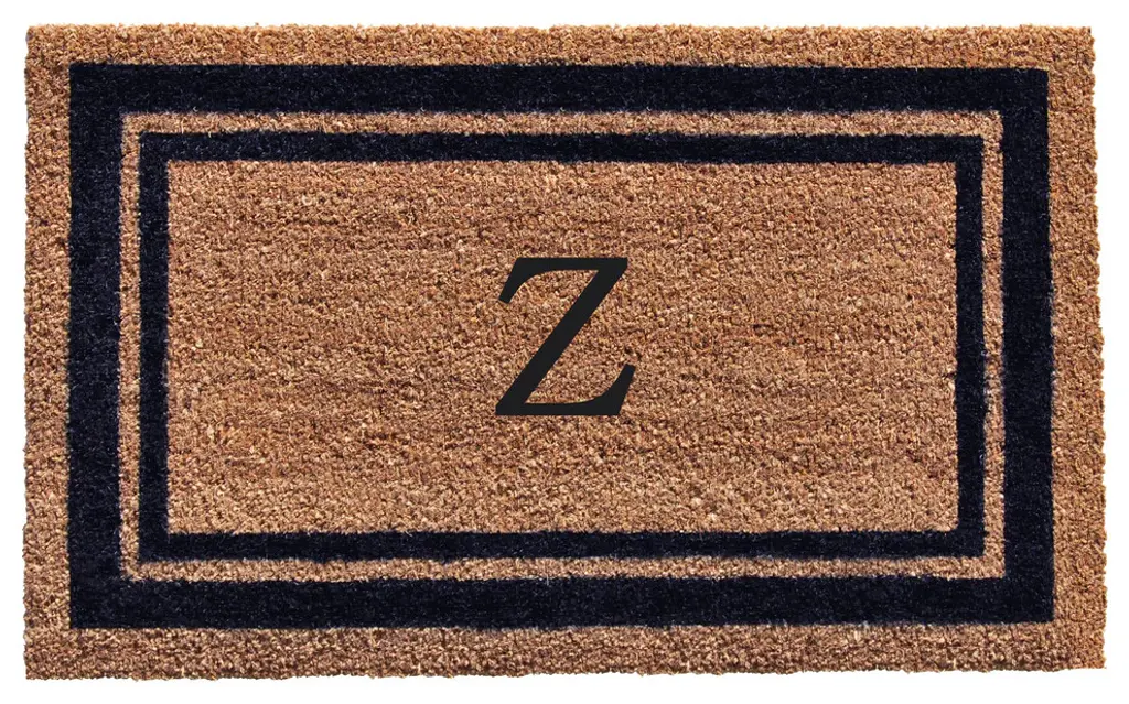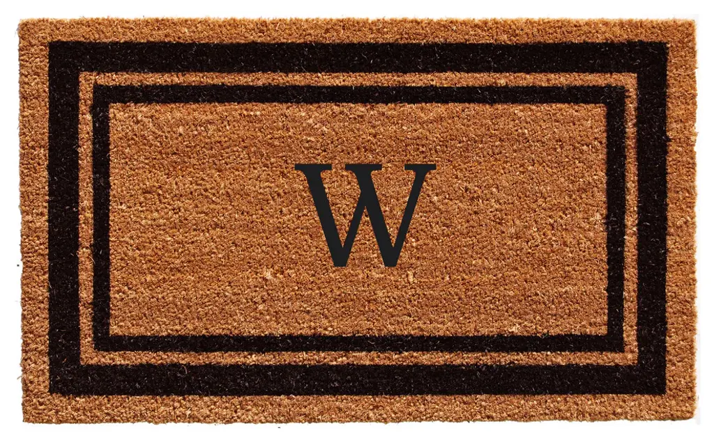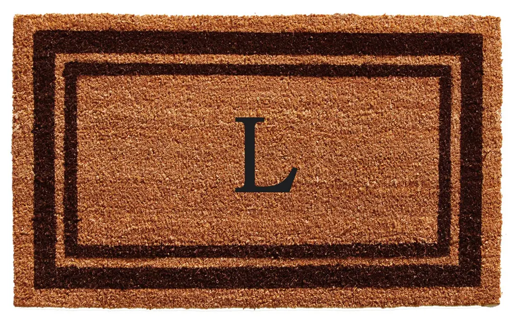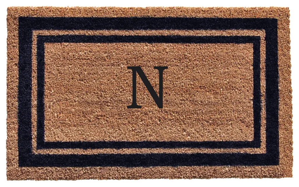 Brighten your entry with this beautiful over-sized monogrammed doormat. Made of natural coir, a durable fiber that scrapes shoe bottoms clean, this doormat has a prominent double border that encases your initial and is vinyl backed to help prevent movement when walked on. Weather tolerant and colorfast, coir doormats absorb moisture, retain their shape and do not mat down regardless of the traffic. Vacuum, shake or lightly hose clean and allow to dry.