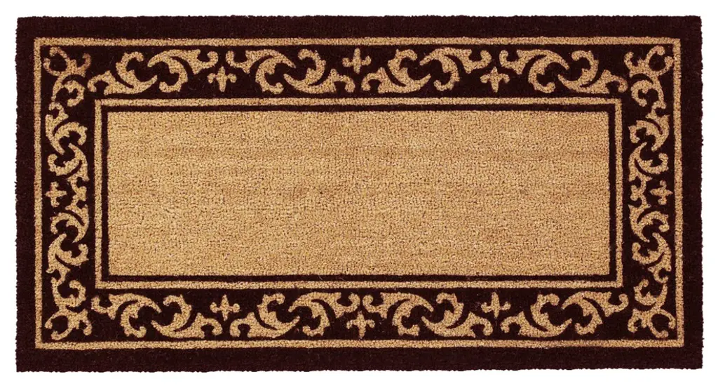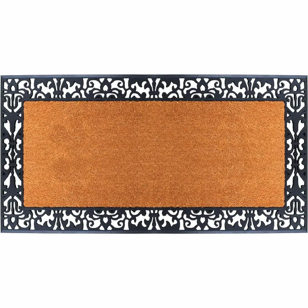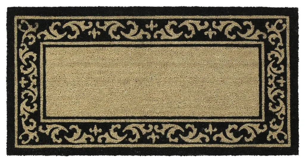 Extra-large to provide maximum coverage, Abbington combines elegance with durability and purpose. This gorgeous doormat is made of natural coir, a durable fiber that naturally scrapes shoe bottoms clean and has a resilient vinyl backing that helps prevent movement. Weather tolerant, this doormat absorbs moisture, retains its shape and will not mat down regardless of the traffic. For best results, use in a sheltered area such as a covered porch, keeping extreme moisture and sunlight to a minimum. Vacuum, sweep or lightly hose clean.