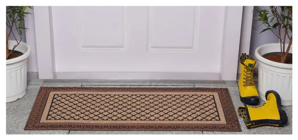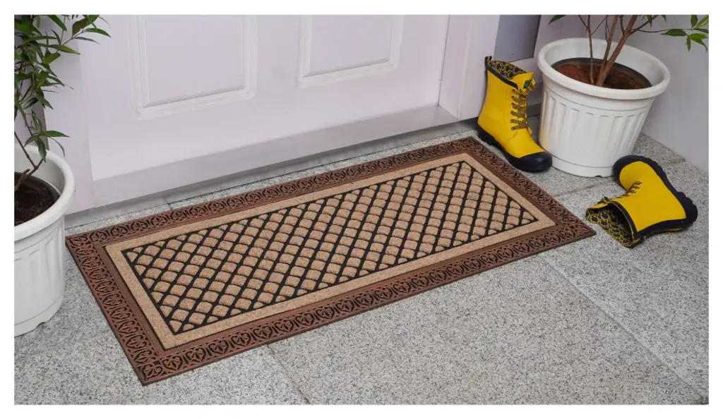 Made of faux coir and rubber. Ideal for both outdoor and indoor use. Coarse synthetic face, similar to natural coir, which is perfect for scraping as they remove and trap dirt, debris, and moisture from shoes. Faux coir doormats do not shed and are long-lasting. In addition, the vinyl backing adds extra stability to the mats by preventing any sliding or movement. To clean your mat vacuum, sweep, or gently hose clean.
