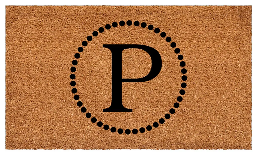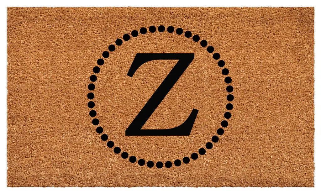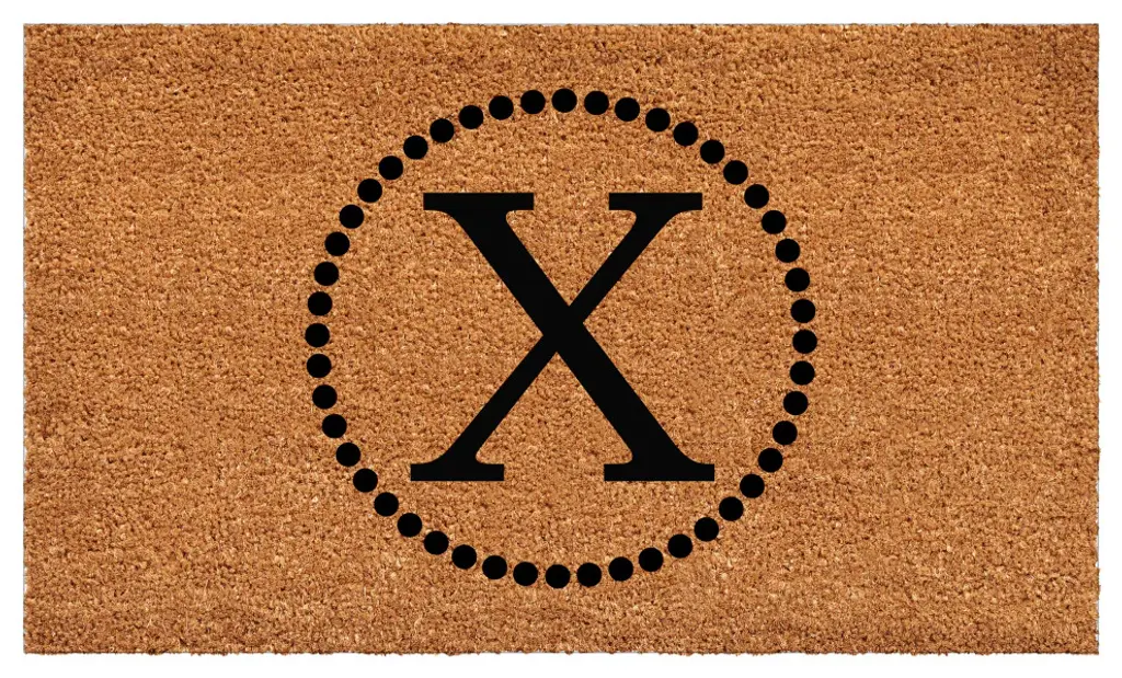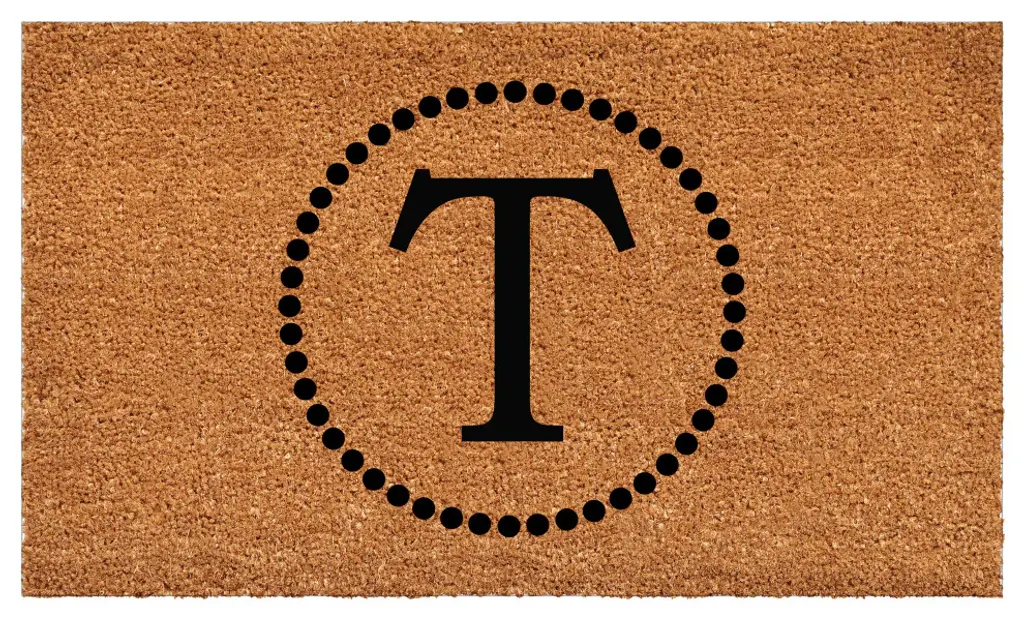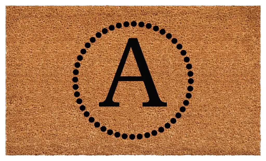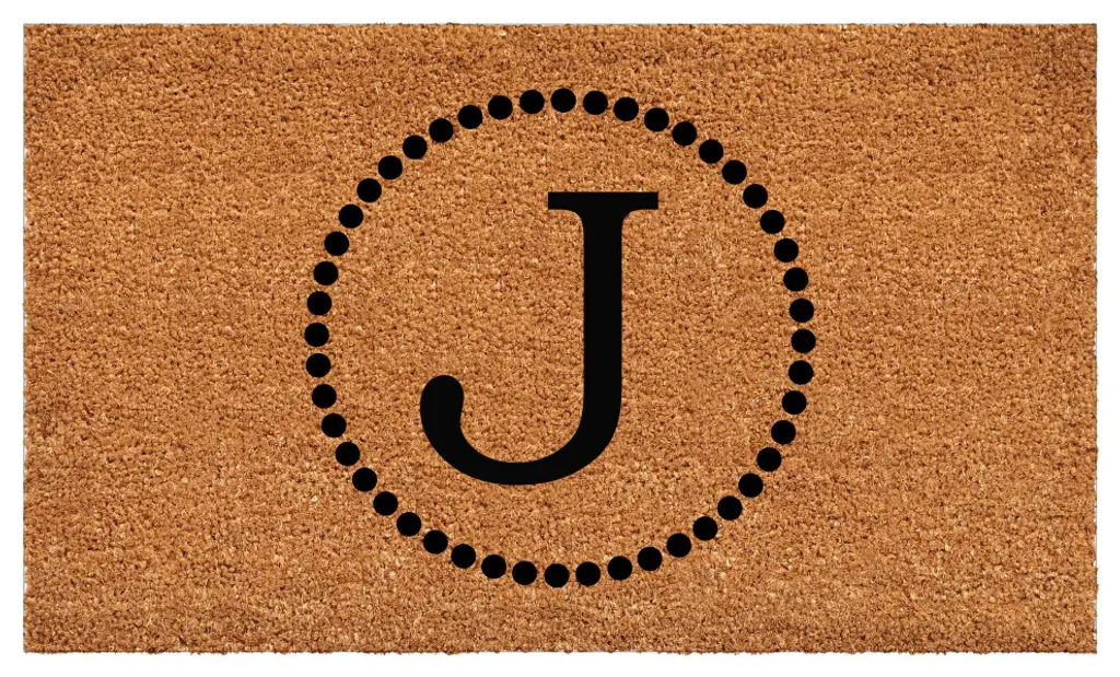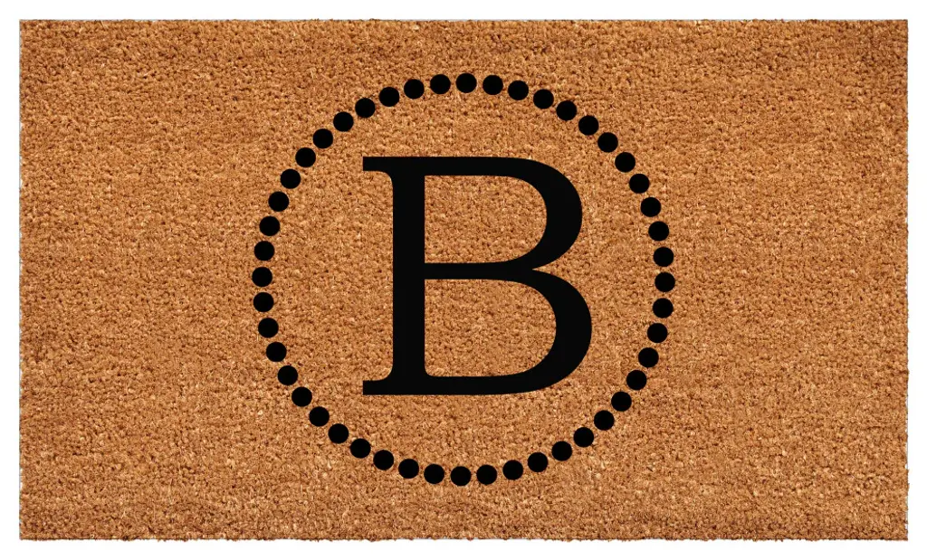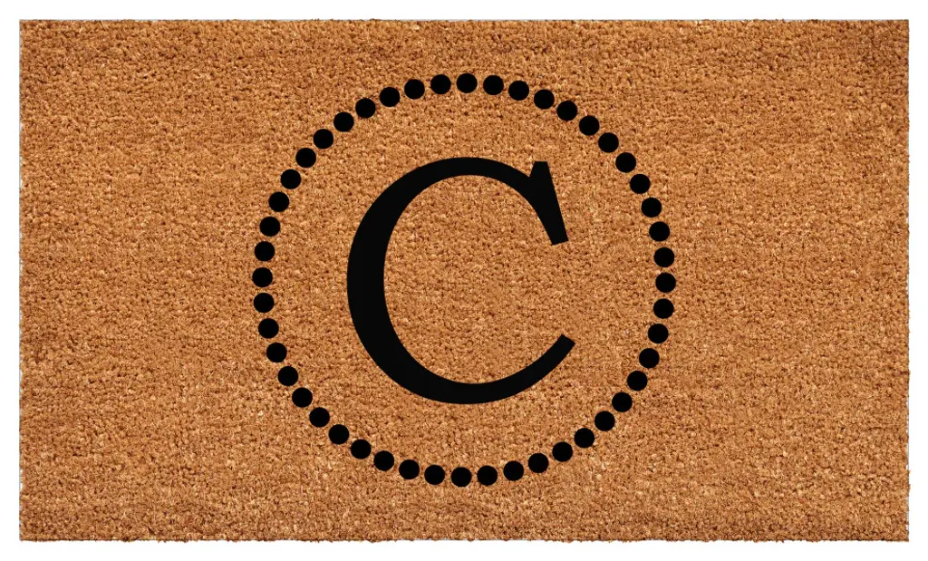 Extra-large for a grand, dramatic look, this stunning monogrammed doormat is made of natural coir, a durable, dense fiber that scrapes shoes clean. Vinyl backed for increased durability and to help prevent movement, this mat is weather tolerant, absorbs moisture and will not mat down regardless of the traffic. For best results, use in a sheltered area such as a covered porch, keeping extreme moisture and sunlight to a minimum. Vacuum, sweep or lightly hose clean.