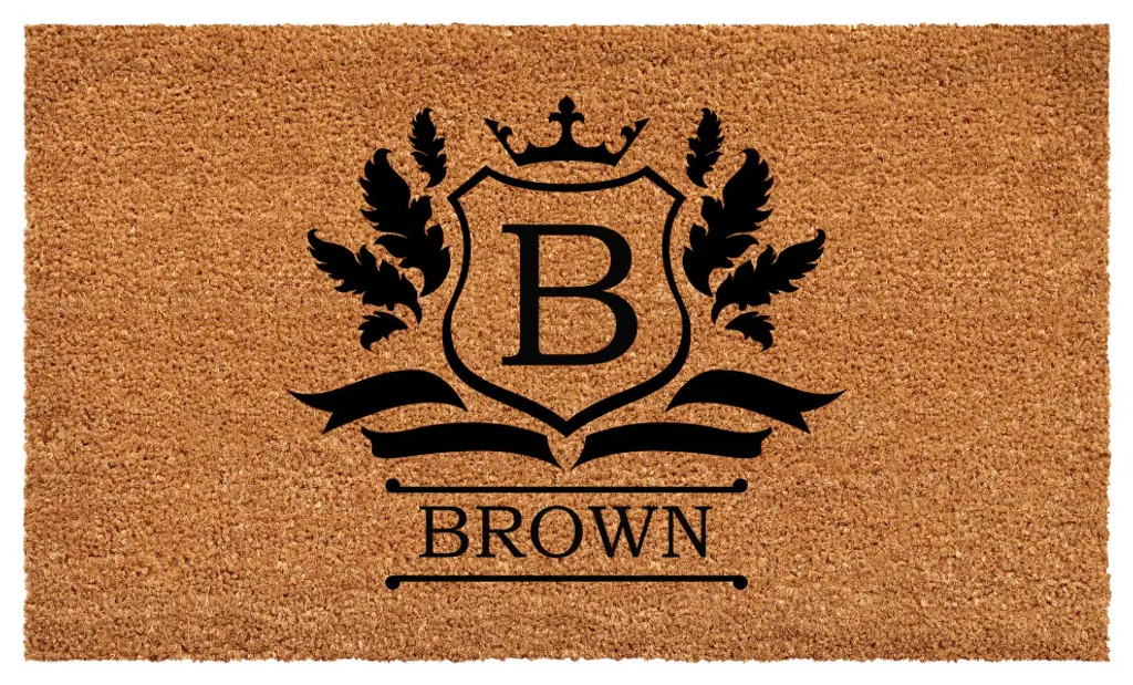Extra-large for a grand, dramatic look, this stunning monogrammed doormat is made of natural coir, a durable, dense fiber that scrapes shoes clean. Vinyl backed for increased durability and to help prevent movement, this mat is weather tolerant, absorbs moisture and will not mat down regardless of the traffic. For best results, use in a sheltered area such as a covered porch, keeping extreme moisture and sunlight to a minimum. Vacuum, sweep or lightly hose clean.