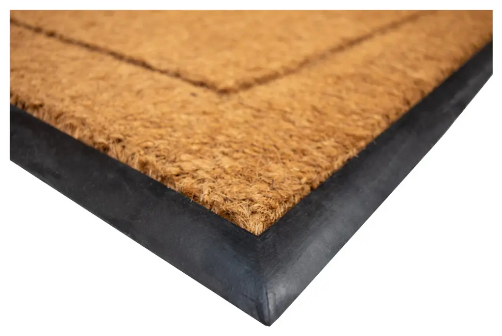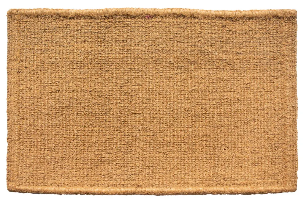 Made of natural coir, a dense fiber that is naturally mold and mildew resistant. Coir is a renewable resource that is durable and weather tolerant. Expertly made by hand of 100% coir, this durable, heavy-duty doormat is earth friendly, naturally abrasive to scrape shoes clean, retains its shape and absorbs moisture. For best results keep in a sheltered area such as a covered porch, keeping extreme moisture and sunlight to a minimum. Average height is 1.5"-2" thick. Vacuum, sweep or lightly hose clean.