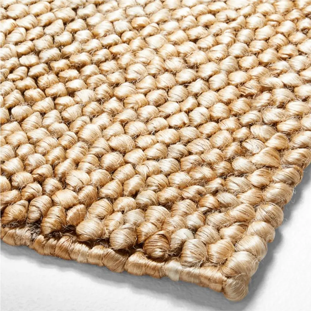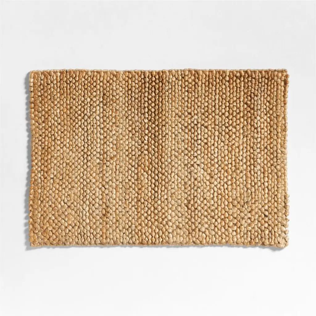 A delightfully chunky texture gives the classic jute doormat a fresh look. Talented craftspeople weave the natural fiber by hand, creating nubby loops with organic charm that wipe shoes effectively. Beautifully utilitarian, the subtle doormat showcases the countless natural golden hues of jute.