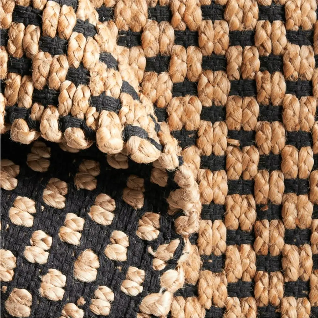 The classic checkerboard pattern gets an organic update in our woven doormat. Jute braids bundled together intersect intricately woven black strips for a modern organic doormat with graphic appeal. Handwoven by skilled craftspeople, the mat brings artisanal and natural beauty to your entryway or mudroom. The chunky texture of the fiber wipes off shoes and boots effectively while welcoming you home with a warm and timeless look.