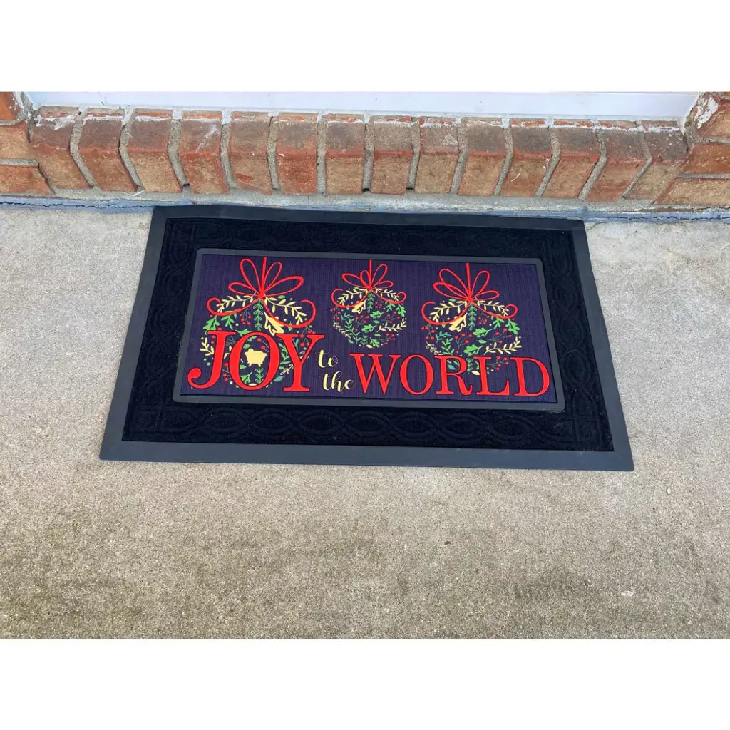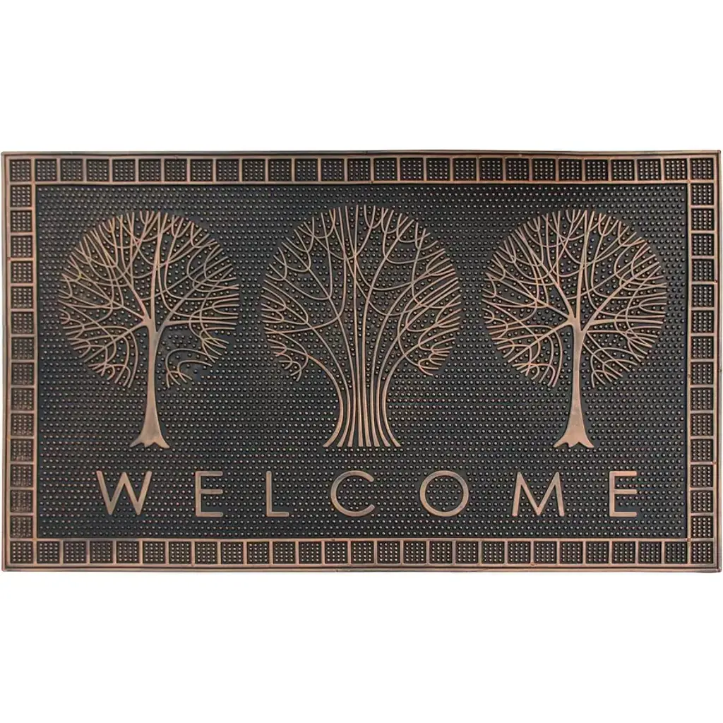 This doormat features a beautiful copper scroll pattern with a Christmas tree, reindeer and snowflakes designs, making it a stylish and functional addition to your holiday decor. Made of a durable and long lasting material, this doormat is perfect for both indoor and outdoor use and will help keep your floors clean while spreading holiday cheer. Add a warm and inviting touch to your doorstep this holiday season with this "Merry Christmas" doormat. Product Features: Gold scroll pattern Features a Christmas tree, reindeer and snowflakes design Reads "Merry Christmas" in silver print Skid-resistant backing Recommended for indoor and outdoor use Care instructions: rinse with a hose and air dry Dimensions: .75"H x 18"W x 30"L Material(s): rubber