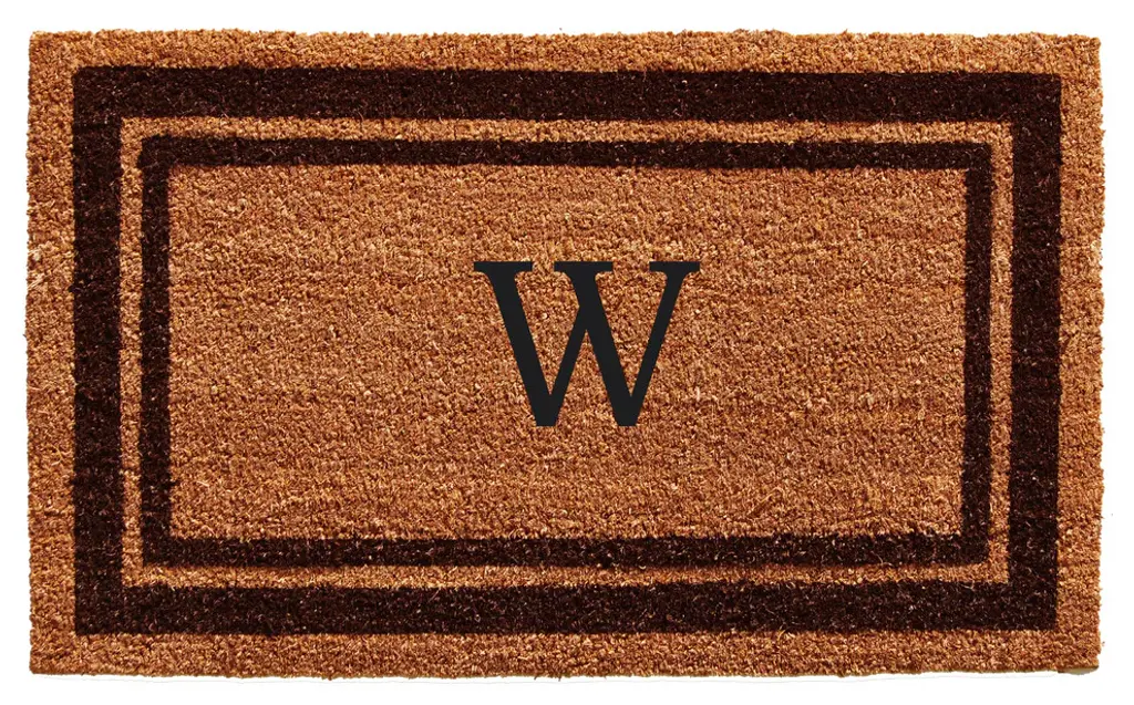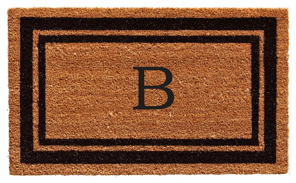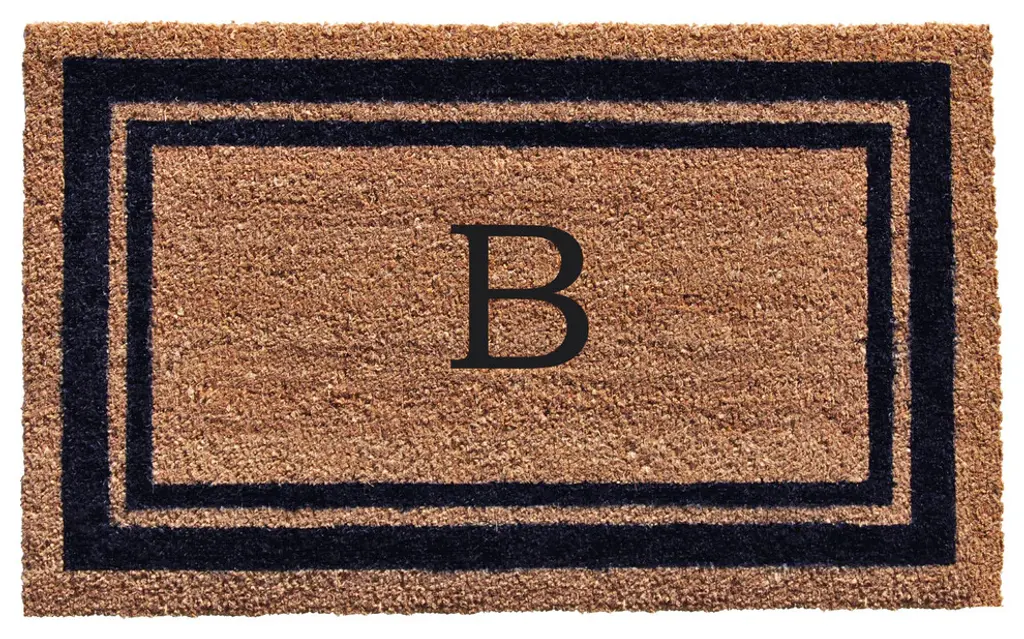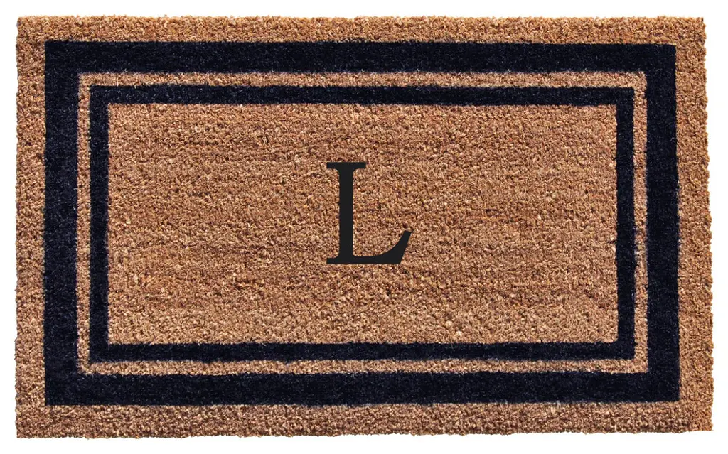 Brighten your home entry with this beautiful monogrammed doormat. Made of natural coir, a durable fiber that scrapes shoe bottoms clean, this doormat has a prominent double border that encases your initial and is vinyl backed to help prevent movement when walked on. Weather tolerant and colorfast, coir doormats absorb moisture, retain their shape and do not mat down regardless of the traffic. Vacuum, shake or lightly hose clean and allow to dry.