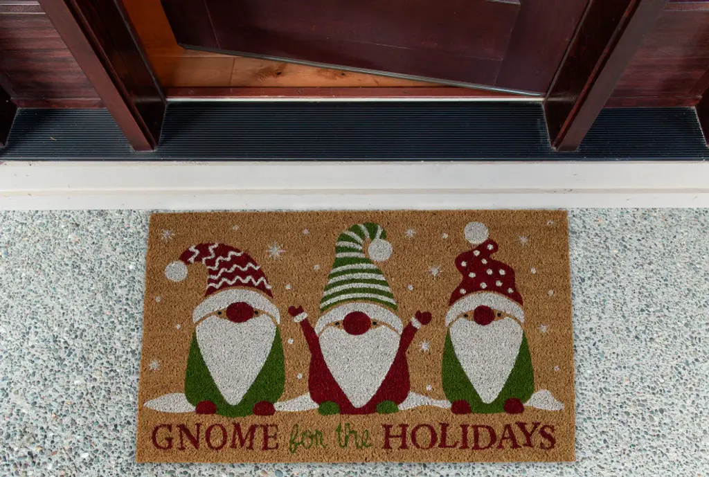 DII Gnome For The Holidays DoormatDII Gnome For The Holidays Doormat100-percent Coconut Coir FiberA strong natural occurring fiber used to create stiff bristles perfect for scraping dirt and mud from shoes and bootsNatural fiber cells absorb water, captures dirt and debris keeping your floors safe from outdoor grimeDoormat measures 18x30 inches and is 0.5 thick providing a lower profile to prevent tripping and provide an easy door clearanceNon-Slip PVC backing to prevent slipping and to keep your rug in placeDII offers doormats with stylish designs to add personality and style to your entryway, including seasonal designs allowing you celebrate each holiday and season in styleThese durable rugs aren''t just for your front porch or entry way, use on patios, in a garage, laundry room, mud porch, entryway - any entry or exit with high traffic would benefit from these indoor and outdoor rugsTo clean, shake brisklyTo prevent fading place in shaded areaStaining may occur if placed on wet surface.