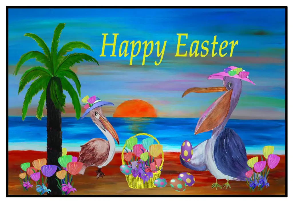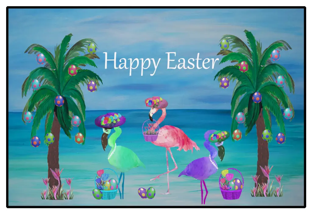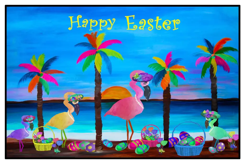 Easter door floor mat flamingos beach art door floor mat for indoor or outdoor with non-skid backing of my art.Easter pelican beach door mat with border available in 5 sizes.This mat can be placed by the door, inside or outside.Non-skid rubberized black backing with a black border that frames the image and adds durability.Easter pelican or flamingos beach floor mats are made from textured-pile carpet with a needle punch non-woven face and a grey basket weave backing.Floor mats can be spot cleaned with mild soap and water, vacuum. My art print is permanently applied by dye sublimation creating a functional art floor decor for anywhere in your home, camper, boat, condo and more.