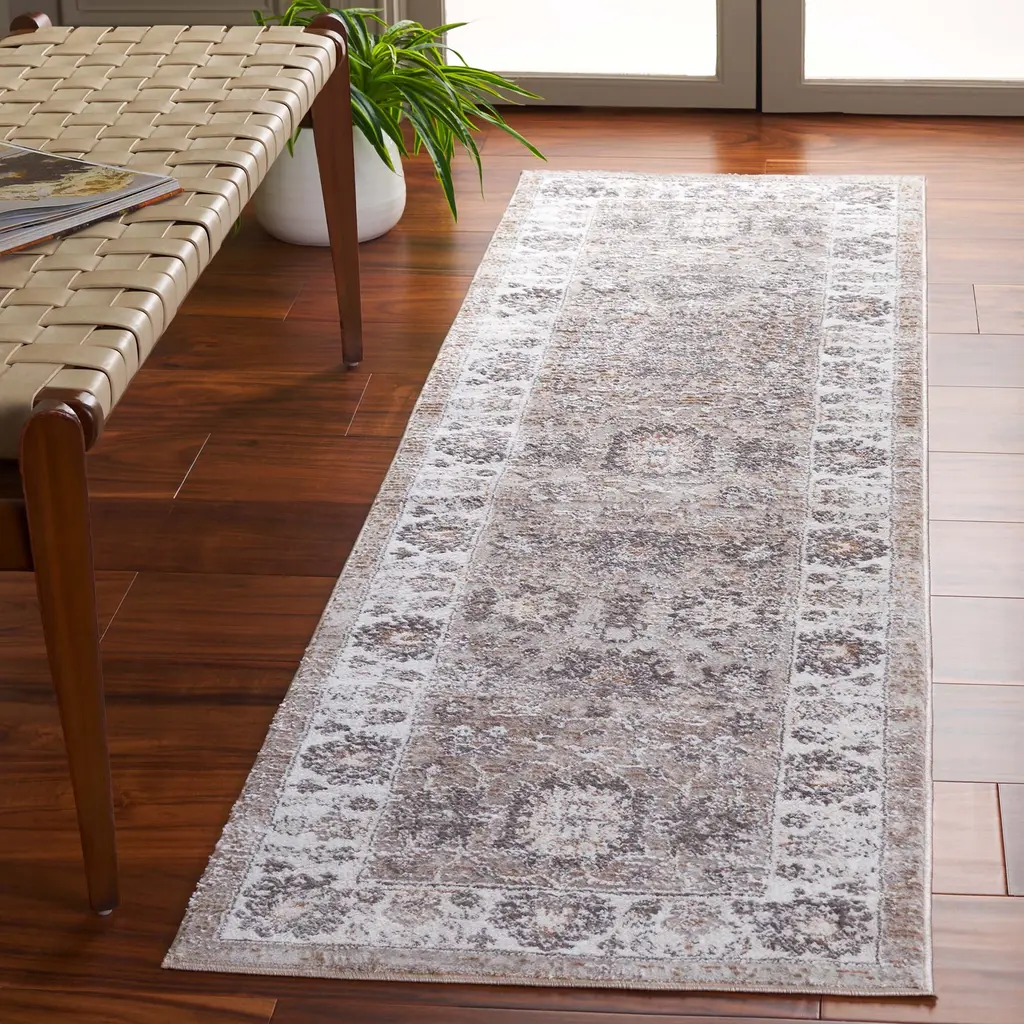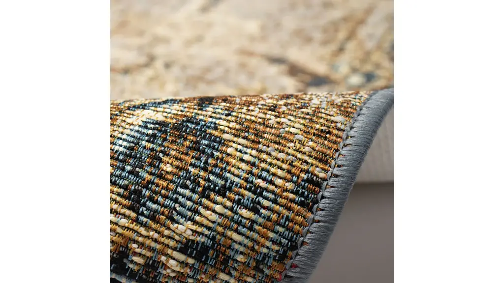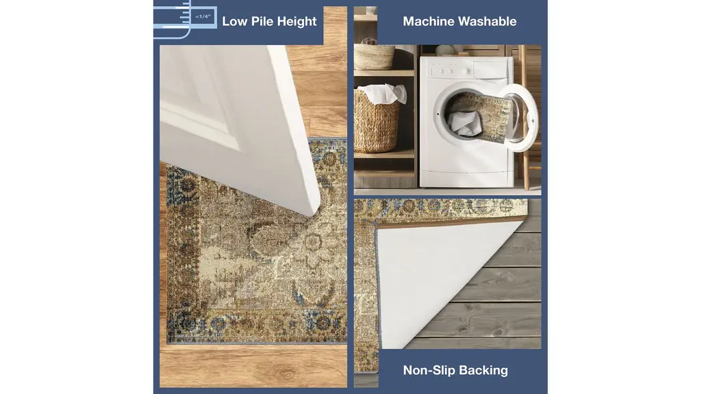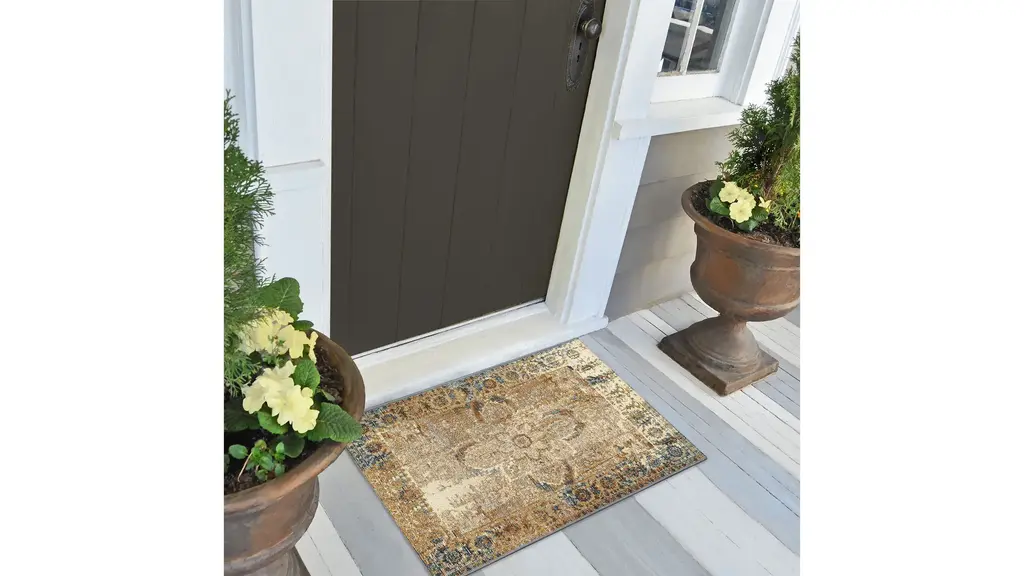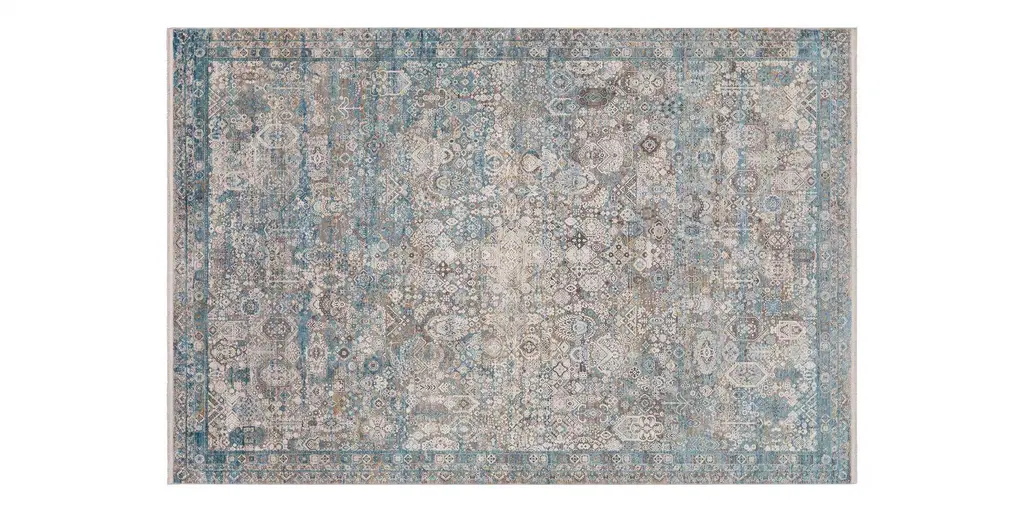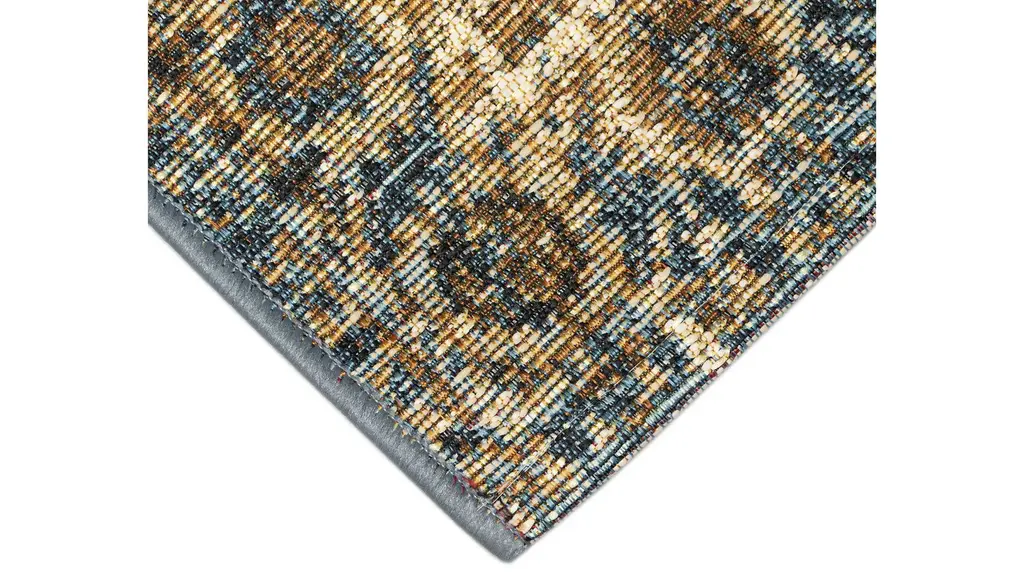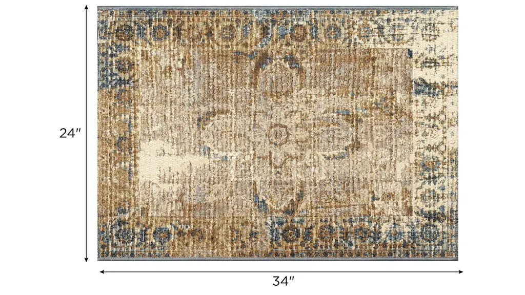 The Esencia Medallion Indoor/Outdoor Mat features a colorful blue and gold border with an overall distressed look with an ornate eight-point center ivory and navy medallion surrounded by an oversized diamond to create a subtle focal point in the design.