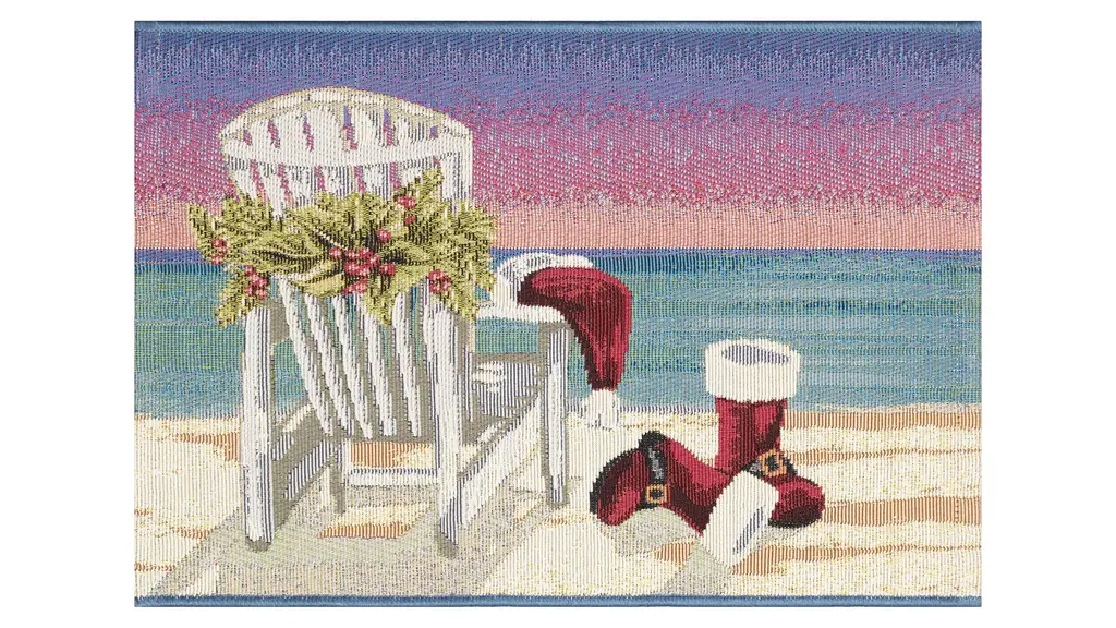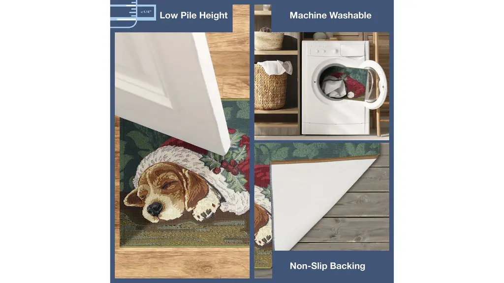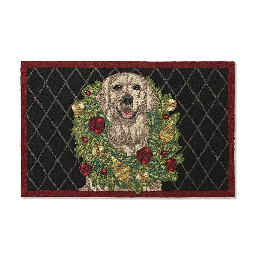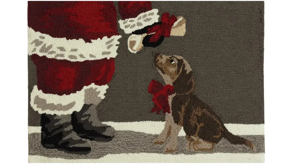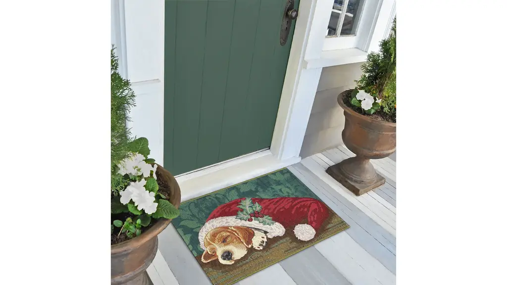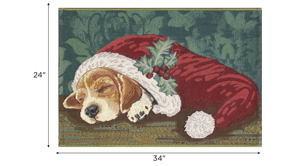 The Esencia Nap In A Cap Indoor/Outdoor Mat features an adorable brown puppy sleeping snuggly nestled in a red Santa hat surrounded by holiday greenery.