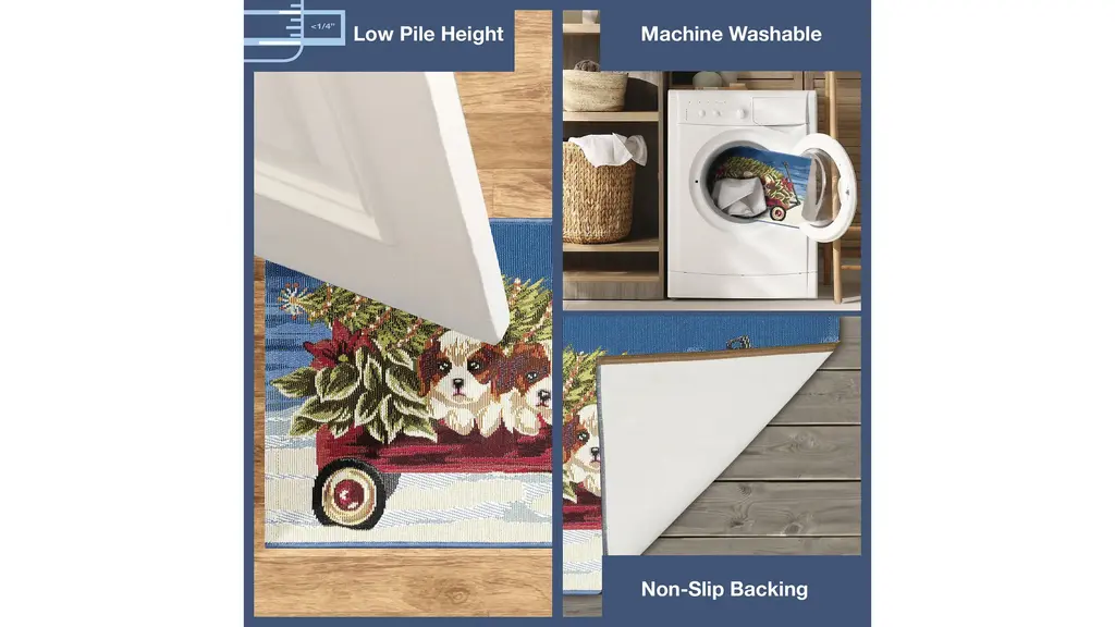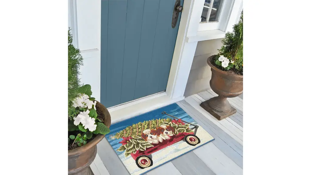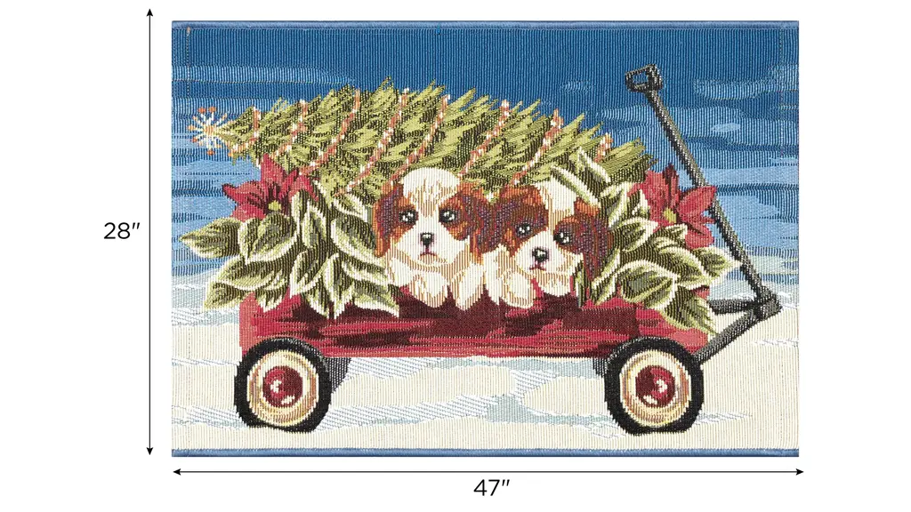 The Esencia Wagon Wonderland Indoor/Outdoor Mat features a red wagon filled with adorable brown and white puppy dogs nestled among holiday greens.
