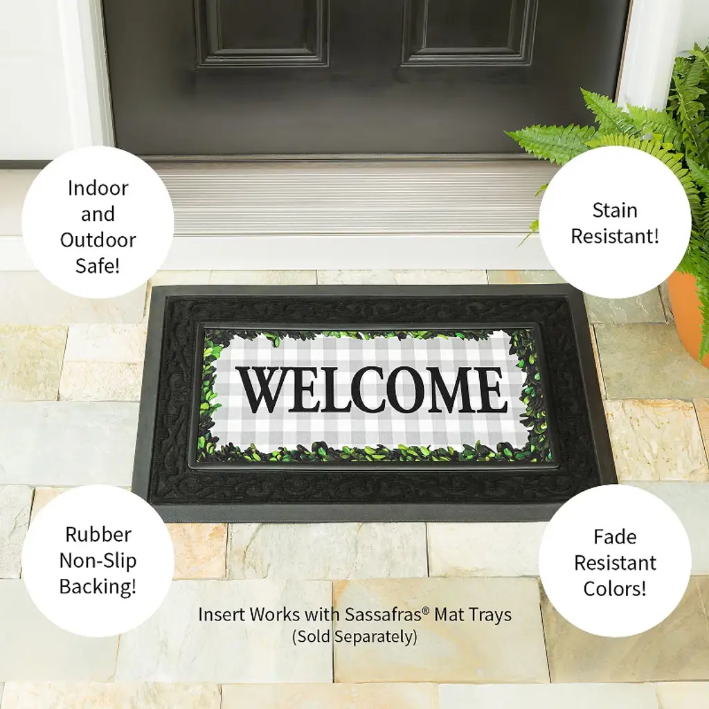 With its classic and sophisticated design, this boxwood sassafras switch mat makes a stunning addition to any outdoor space. With it's welcoming message and bold plaid pattern, this door mat will greet guests and neighbors in style all year round. Part of our bestselling Sassafras Mat collection, this mat insert is crafted from printed polyester with a rubber backing, and is designed to fit neatly within any of our sassafras bases and trays. Designs are sublimated onto the outdoor-safe material using fade-resistant inks. Perfect for indoor or outdoor use, these versatile Sassafras mats successfully trap dirt while making a stylish statement.