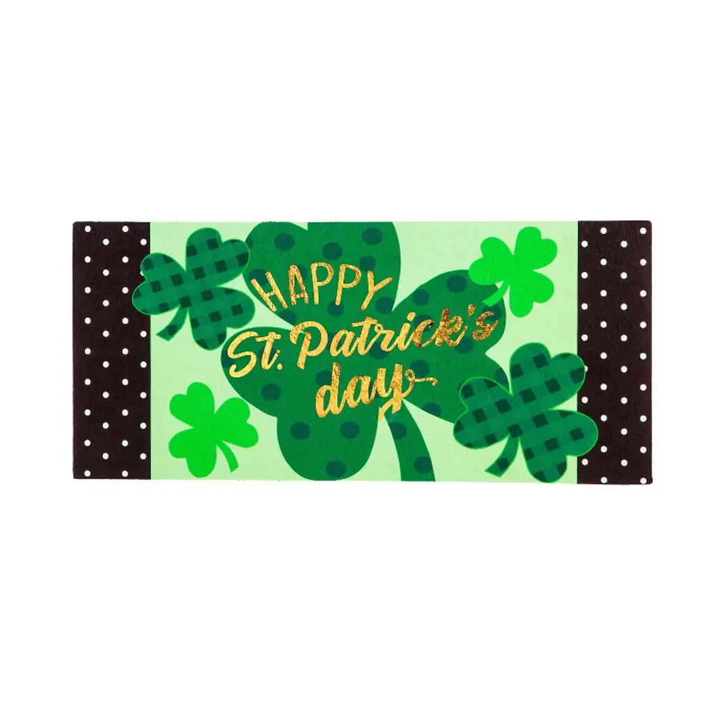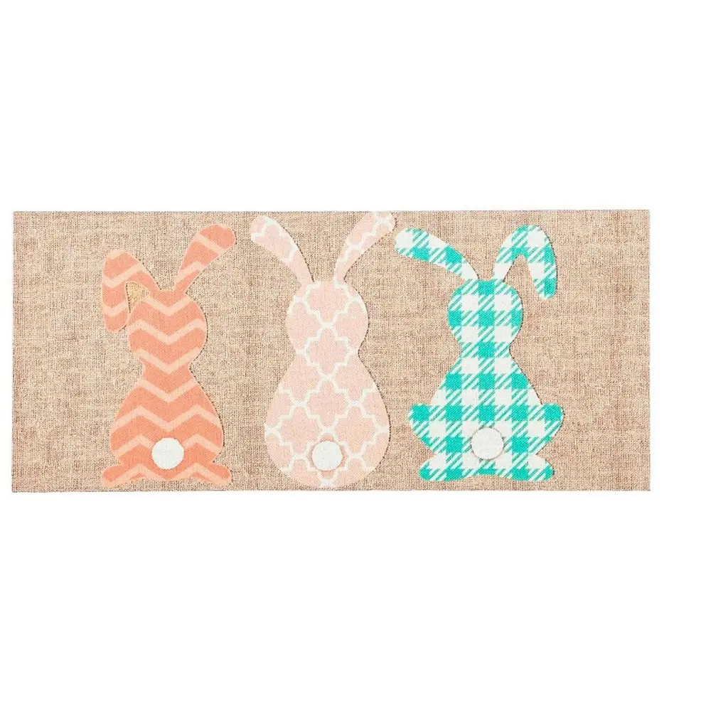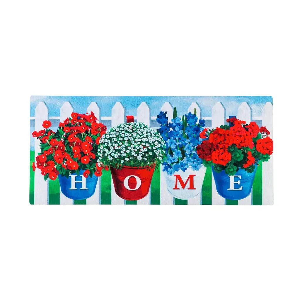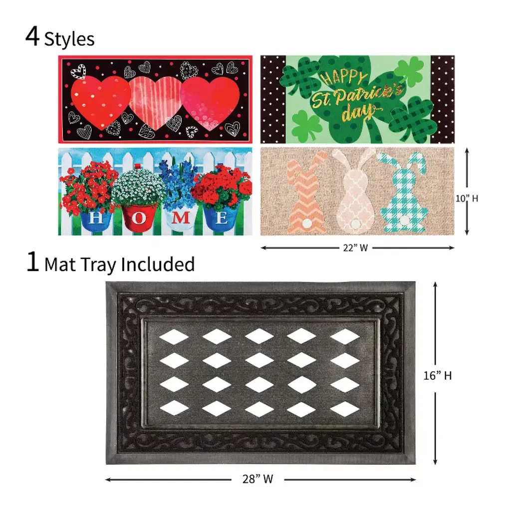 Welcome year-round style to your doorstep with this festive offering. Cute shabby chic bunnies help you welcome spring and Easter, festive hearts celebrate valentine's Day, lucky shamrocks help wish visitors a happy St. Patricks Day and yer-round or Patriotic style is displayed on the red, white and blue HOME door mat.