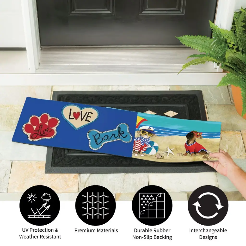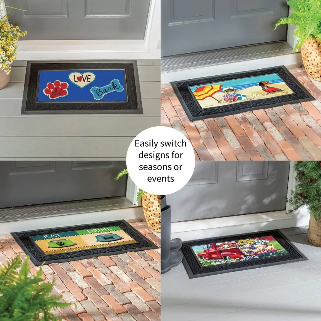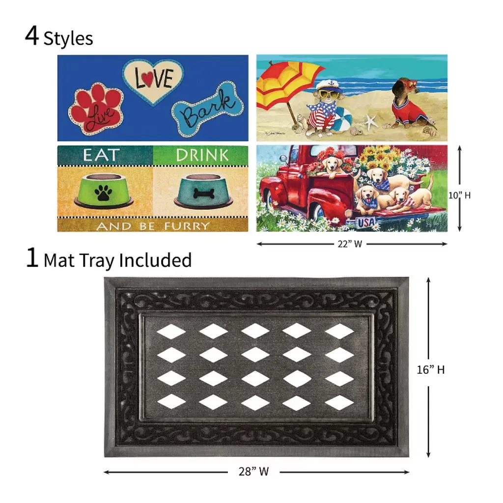 This beautiful set captures all the seasons. Easily switch up your seasonal style at your door step! Set a welcoming tone for guests and friends with this well made door mat and tray collection. Designed to pick up dirt and debris while adding unique flair to your entryway. Puuurfect for pet lovers this charming set features a bevy of dog-themed designs to delight! Mat tray included with 4 Sassafras Mats.