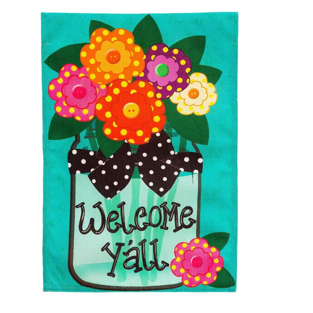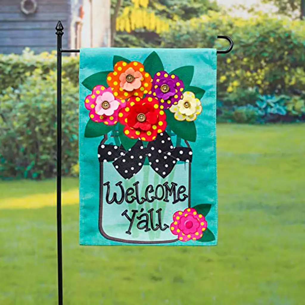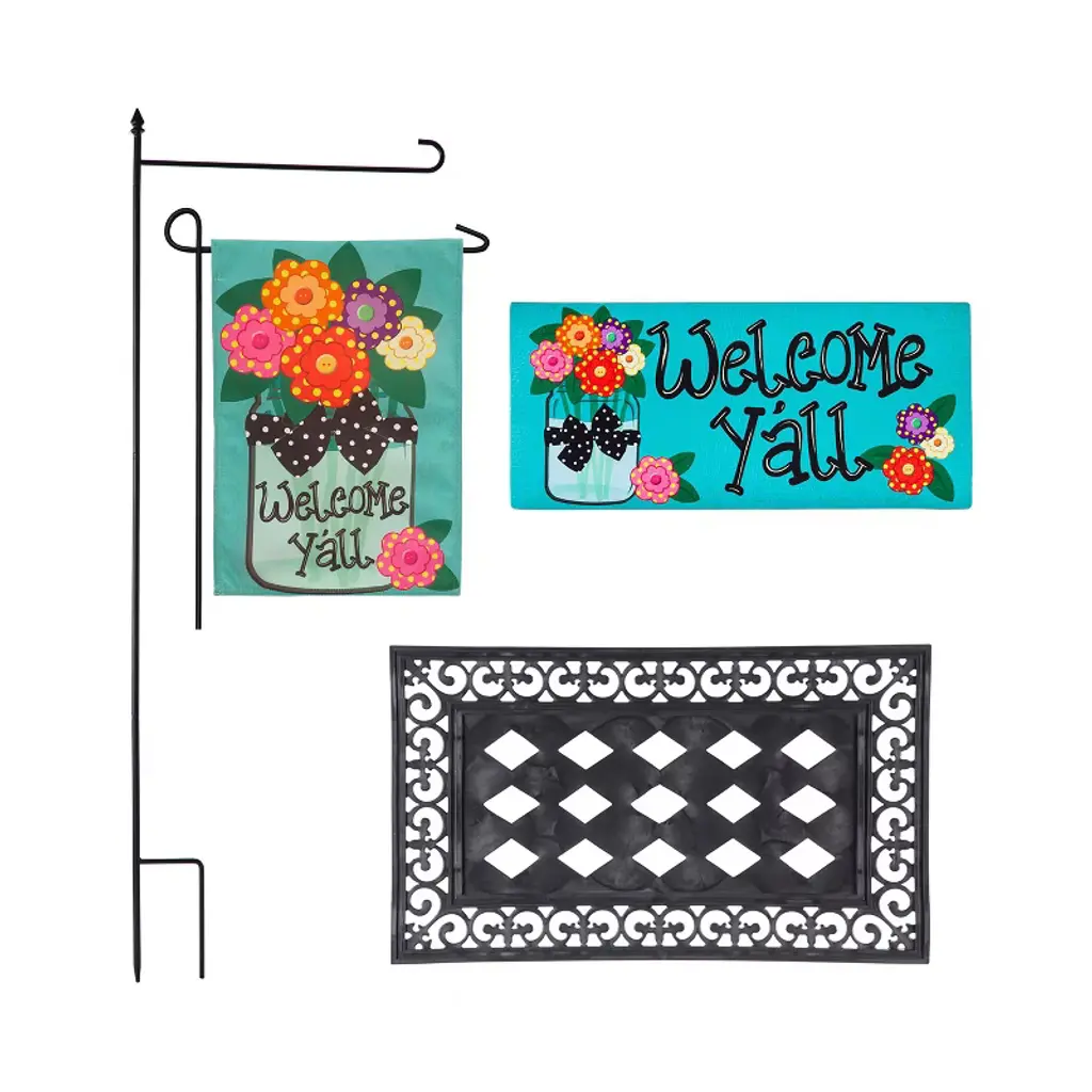 This incredible front door, garden or patio decor set will bring a smile to your face and all who visit! The garden-themed door mat and matching house flag are crafted to be both durable and beautiful. They both feature a bevy of blooms which sit inside a rustic mason jar, with the friendly message "Welcome Y'all" letting everyone know that this must be the place. Our Sassafras Mats are a fabulous way to have easy, year-round personality right at your doorstep! Interchangeable and eco-friendly, they bring style and charm to your door step. This set is also a great gift idea for housewarming parties, new neighbors, Mothers Day or for any garden lover! This incredible set includes one adorable mat and a matching house flag and house flag stand. It makes changing out your welcome mat fast and easy. Sassafras Switch Mats work with the Sassafras bases and are the perfect fit for our mat tray. Measures approximately 10 inches W x 22 inches L x 1/8 inch D. It is conveniently made from a stain resistant polyethylene with rubber backing to hold in place. Spot clean only. Evergreen Flag: Evergreen Flag is the perfect "Greeting Card of Your Home." Welcome neighbors, friends and family with a variety of unique and fun designs. Simply click our brand name above. Best as a set: Save by buying these fun and playful designs as a set. Well made and perfect for spring, summer or year round you'll enjoy them for seasons to come.