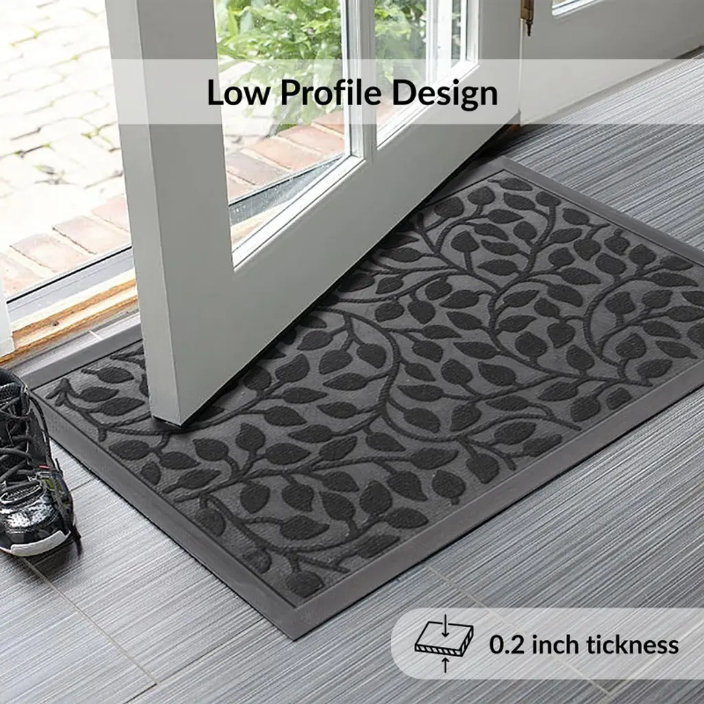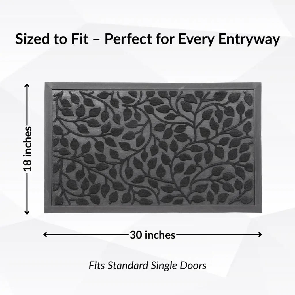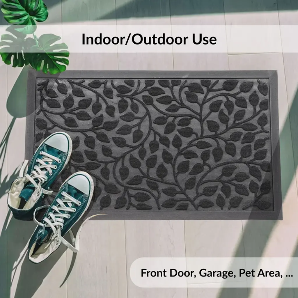 Welcome guests while keeping dirt outside with this Black Leaf Design Outdoor Welcome Mat. Designed to trap mud, debris, and moisture, this entryway rug keeps your floors cleaner and drier. Moreover, the 30x18 inch size fits standard doors perfectly without blocking entry. Thanks to its low 0.2-inch profile, this outdoor door mat slides easily under most doors without bunching. In addition, the textured polyester surface brushes shoes clean while adding visual depth and style to your entrance. Backed with 100% recycled rubber, the indoor outdoor rug stays firmly in place and resists slipping in high-traffic areas. As a result, it works well on porches, patios, garages, or inside mudrooms. Furthermore, its heavy-duty construction withstands outdoor elements like rain, snow, and sun exposure. Even after repeated use, this front porch rug maintains its shape and performance. For added convenience, cleaning is quick and hassle-free—simply shake, vacuum, or rinse with a hose. Whether used indoors or outdoors, this garage floor mat brings the perfect mix of function and style. Above all, it offers long-lasting use and dependable floor protection for everyday life. Choose it for reliable dirt control and a clean, welcoming entrance all year round.