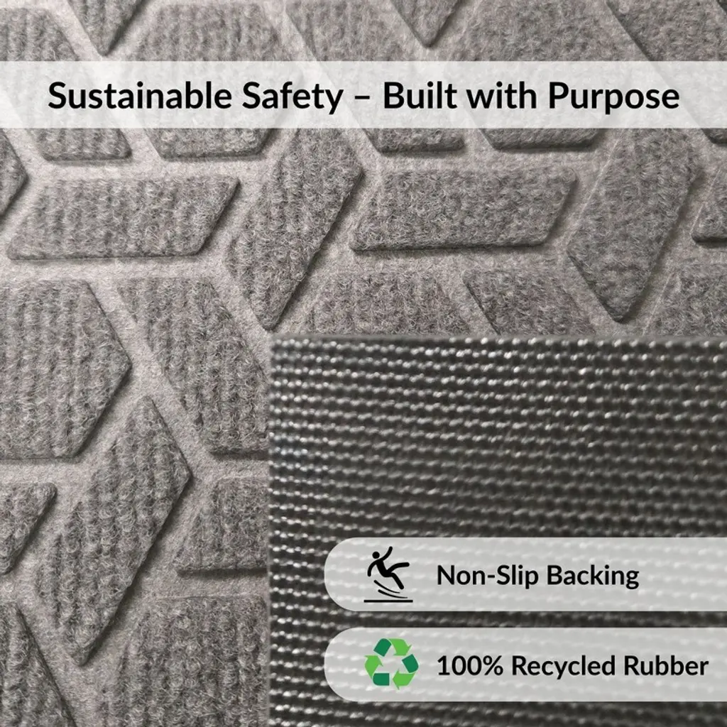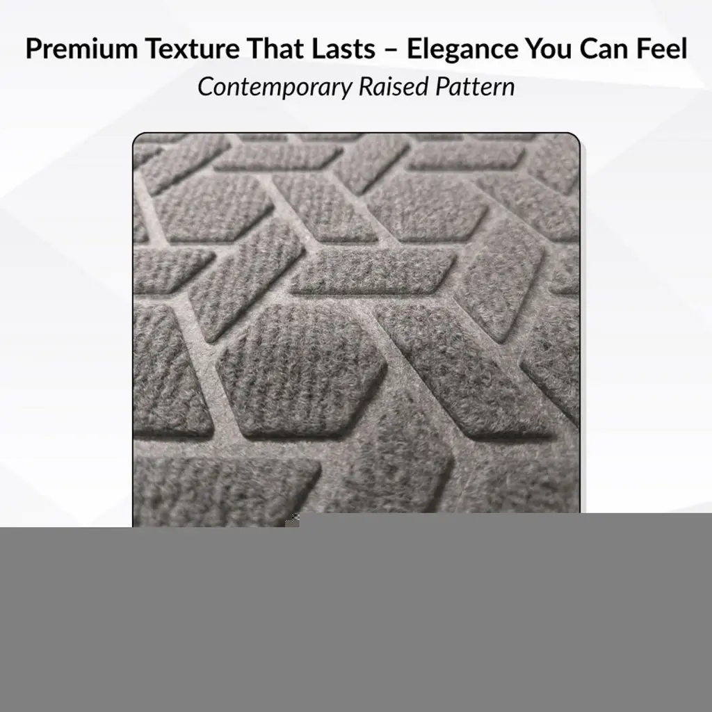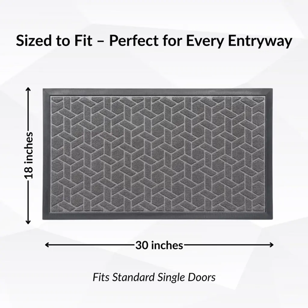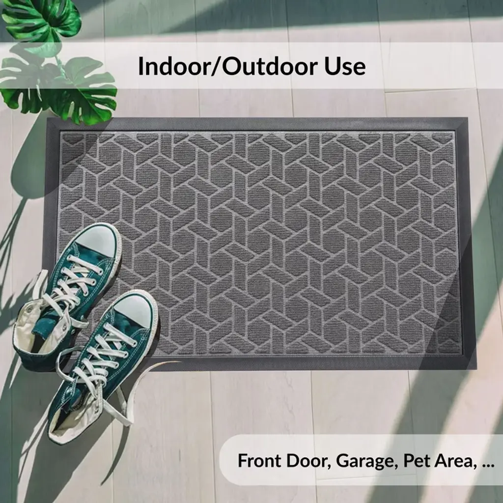 Welcome guests while keeping dirt outside with this Gray Geometric Design Outdoor Welcome Mat. Designed to trap mud, debris, and moisture, this entryway rug keeps your floors cleaner and drier. Moreover, the 30x18 inch size fits standard doors perfectly without blocking entry. Thanks to its low 0.2-inch profile, this outdoor door mat slides easily under most doors without bunching. In addition, the textured polyester surface brushes shoes clean while adding visual depth and style to your entrance. Backed with 100% recycled rubber, the indoor outdoor rug stays firmly in place and resists slipping in high-traffic areas. As a result, it works well on porches, patios, garages, or inside mudrooms. Furthermore, its heavy-duty construction withstands outdoor elements like rain, snow, and sun exposure. Even after repeated use, this front porch rug maintains its shape and performance. For added convenience, cleaning is quick and hassle-free—simply shake, vacuum, or rinse with a hose. Whether used indoors or outdoors, this garage floor mat brings the perfect mix of function and style. Above all, it offers long-lasting use and dependable floor protection for everyday life. Choose it for reliable dirt control and a clean, welcoming entrance all year round.