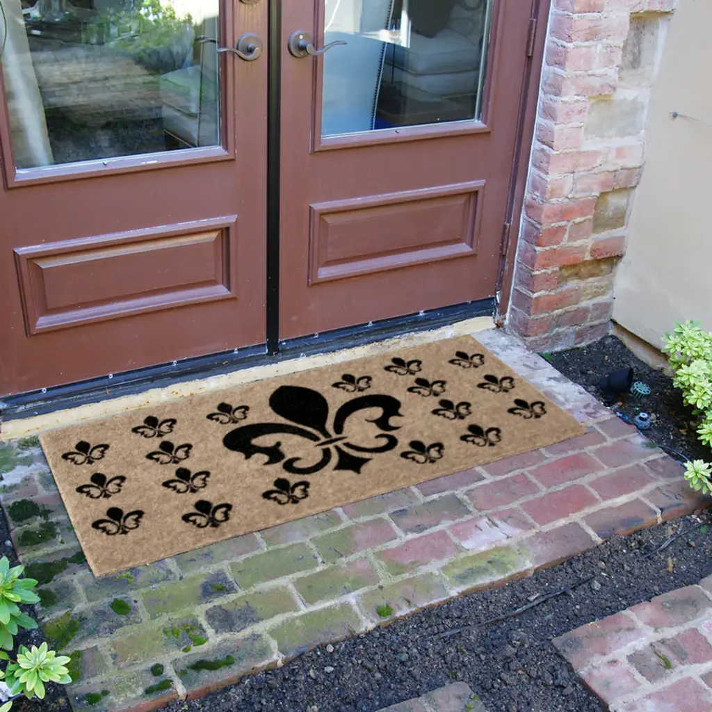The fleur de lis has become a symbol used to capture the magic of Europe''s France. Originating in the early medieval western world, the fleur de lis was adopted by the early French monarchs as a coat of arms. This fleur de lis doormat has been adorned with a large fleur de lis surrounded by an arrangement of smaller fleur de lis symbols in the background. These entry door mats live up to their name when it comes to their benefits. For one, these entryway mats are made out of quality ingredients. Their bristles are made out of natural and sturdy coir. Coir, also called coco, is a tough fiber material extracted from the outer husks of coconuts. When bundled together, it creates a coarse surfacing for the bristles of these coco coir mats. Each of these coir mats also has a backing made out of a strong PVC material. This provides each fleur de lis doormat with a design made for durability. These entry door mats are not only made out of superior ingredients, they are made for easy maintenance. These entryway mats just need a simple brush or shake to release the outdoor rubble captured between their coco coir bristles. If these techniques are not doing the trick, a hose can be taken to clean these coco coir mats. Not only easy to care for, each fleur de lis doormat is available in two sizes. Available in a size of 18 x 30, these standard coir mats are sized for a single doorway. If you have a double door entryway, the 24 x 57 large door mat size is a more suitable choice. If doormats are needed for multiple entryways, these estate style home doormats can be partnered up with their smaller counterparts for a matching home aesthetic. Not only available in two sizes, each fleur de lis doormat is capable of trapping moisture. Moisture gets stuck within the bristles of these coco coir mats, helping prevent it from dirtying your home''s flooring.