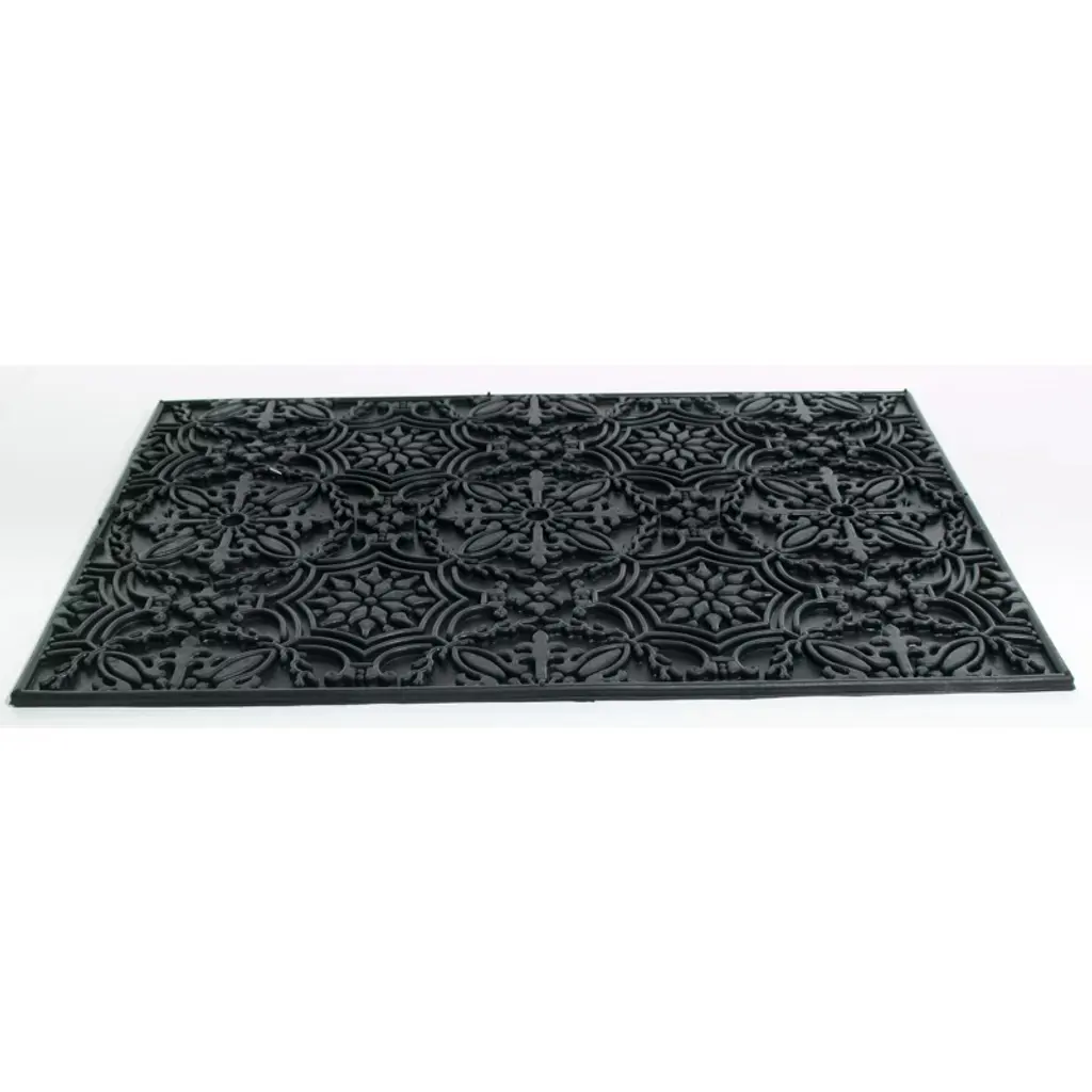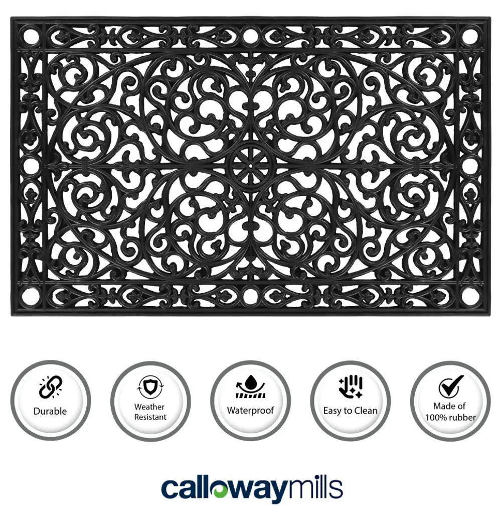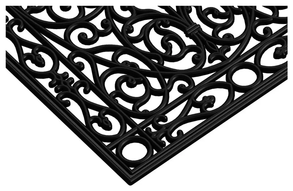 Extra-large for maximum coverage, this stunning doormat is made of 100% rubber and is impervious to the elements of weather. Detailed scroll that emulates wrought iron, this heavy-duty mat makes a gorgeous addition to any porch or patio area. Hose clean.