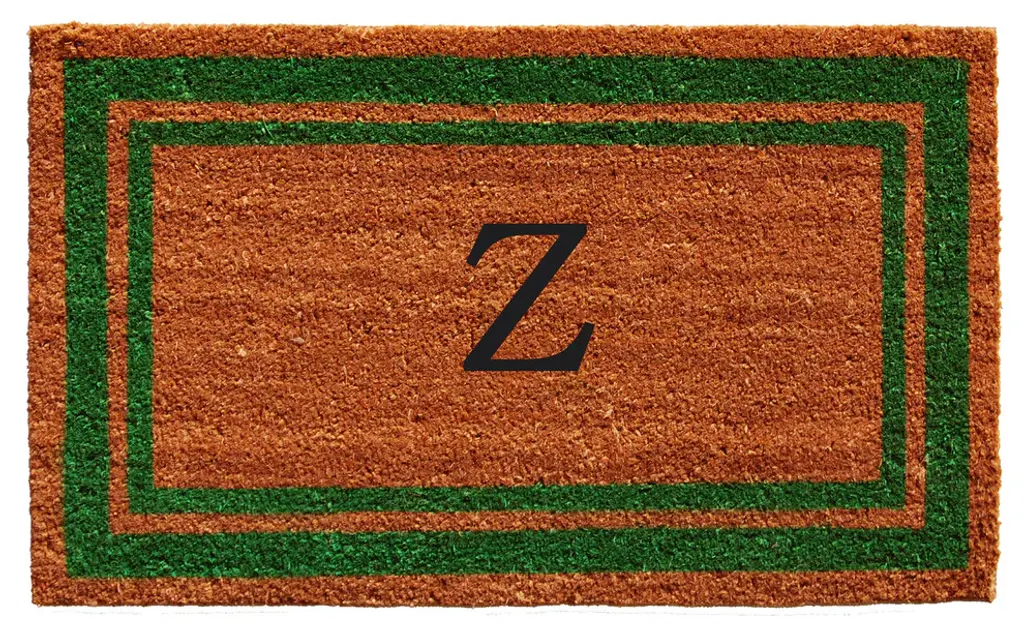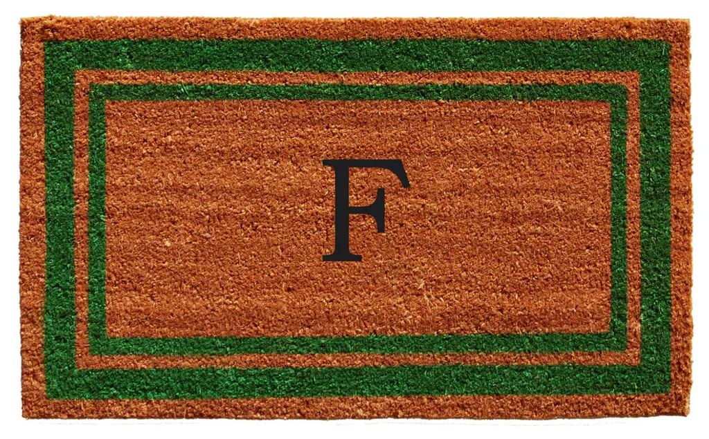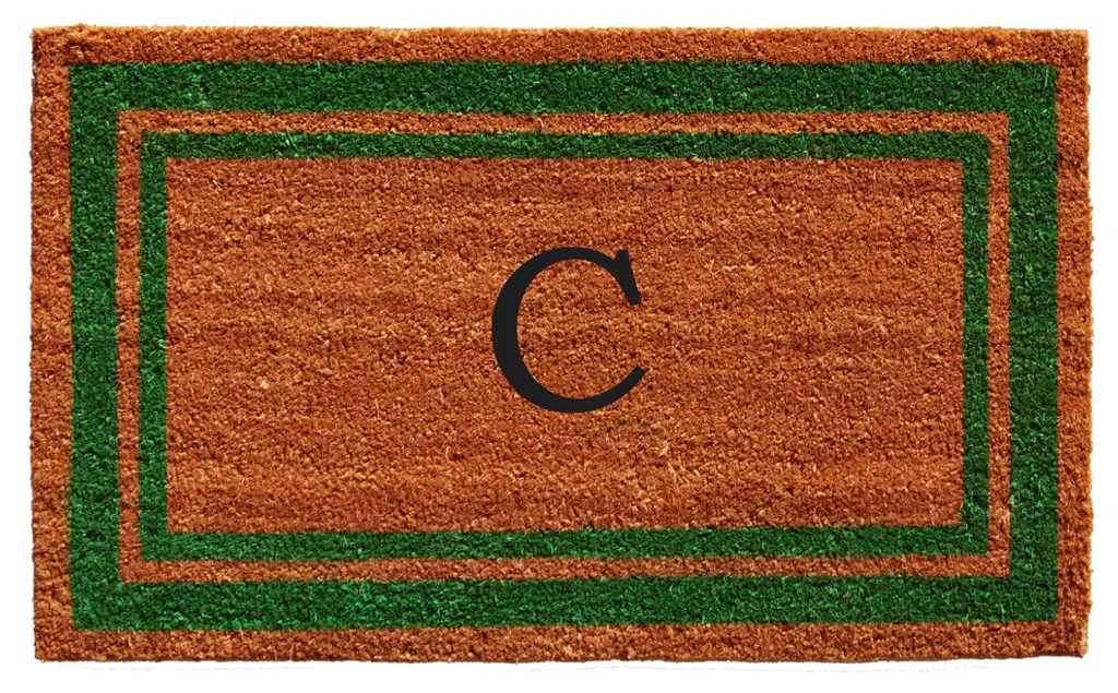 Brighten your home entry with this beautiful monogrammed doormat. Made of natural coir, a durable fiber that scrapes shoe bottoms clean, this doormat has a prominent double border that encases your initial and is vinyl backed to help prevent movement when walked on. Weather tolerant and colorfast, coir doormats absorb moisture, retain their shape and do not mat down regardless of the traffic. Vacuum, shake or lightly hose clean and allow to dry.