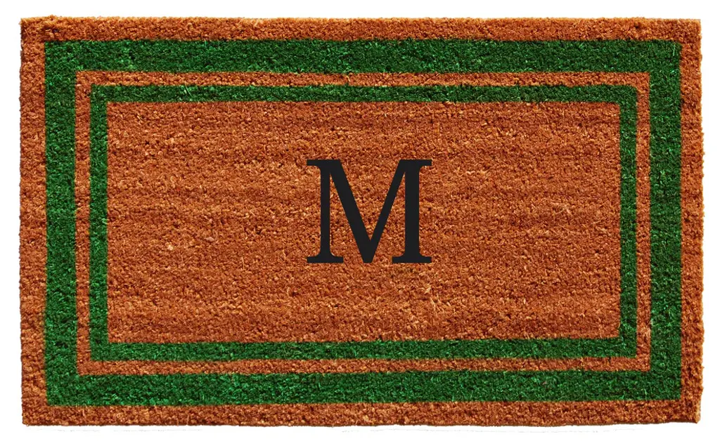 Brighten your entry with this beautiful over-sized monogrammed doormat. Made of natural coir, a durable fiber that scrapes shoe bottoms clean, this doormat has a prominent double border that encases your initial and is vinyl backed to help prevent movement when walked on. Weather tolerant and colorfast, coir doormats absorb moisture, retain their shape and do not mat down regardless of the traffic. Vacuum, shake or lightly hose clean and allow to dry.