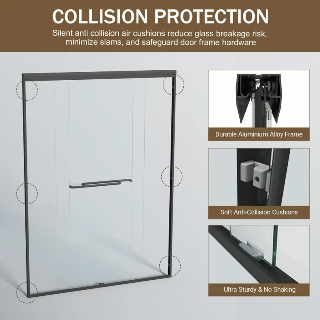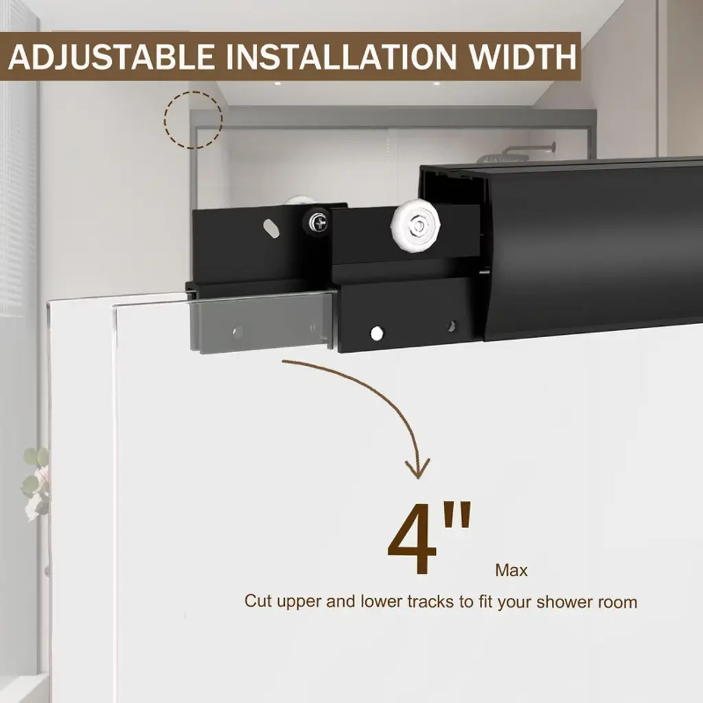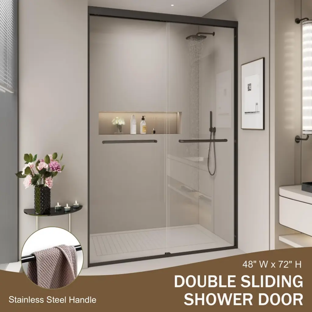 Gulches double sliding shower door delivers sleek spa style to compact bathrooms Measuring 44 to 48 inches wide and 72 inches high the semi frameless bypass unit uses two 24 inch panels that glide left or right for a wide 22 inch entry without swing space The 6 mm ANSI certified clear glass is backed with an invisible explosion proof film that keeps shards attached if impact occurs so cleanup is safe The lightweight aluminum alloy frame is finished in deep matte black and features anti collision corners that protect both glass and wall tiles Full length clear vinyl seals lock water inside while stainless steel handles offer a secure grip The top rail can be cut on site for a custom fit and the system can be installed to slide from either side Every package contains one top rail one bottom rail two glass panels four silent rollers two handles wall profiles seals screws and a step by step guide Average install time is under an hour Once mounted the door glides quietly and stays stable for years of daily use Enjoy durable elegance backed by Gulches engineering