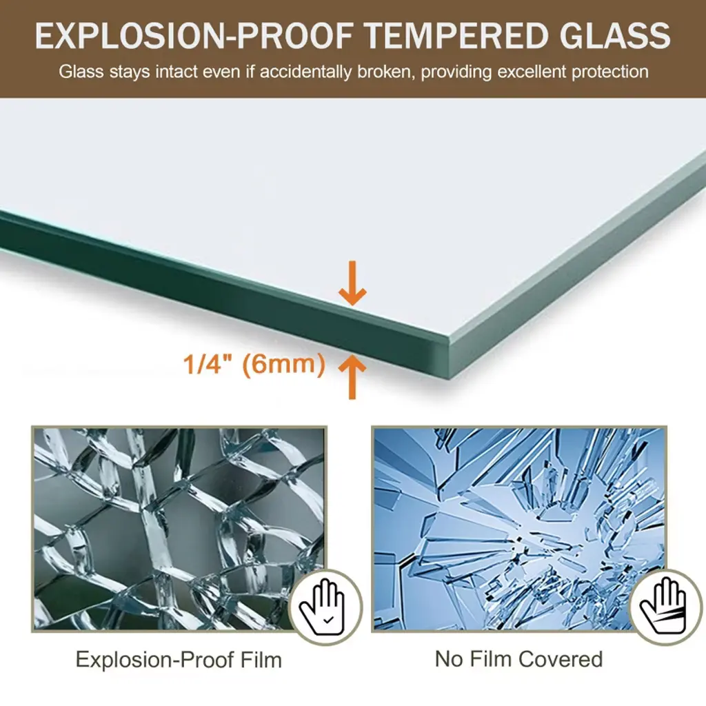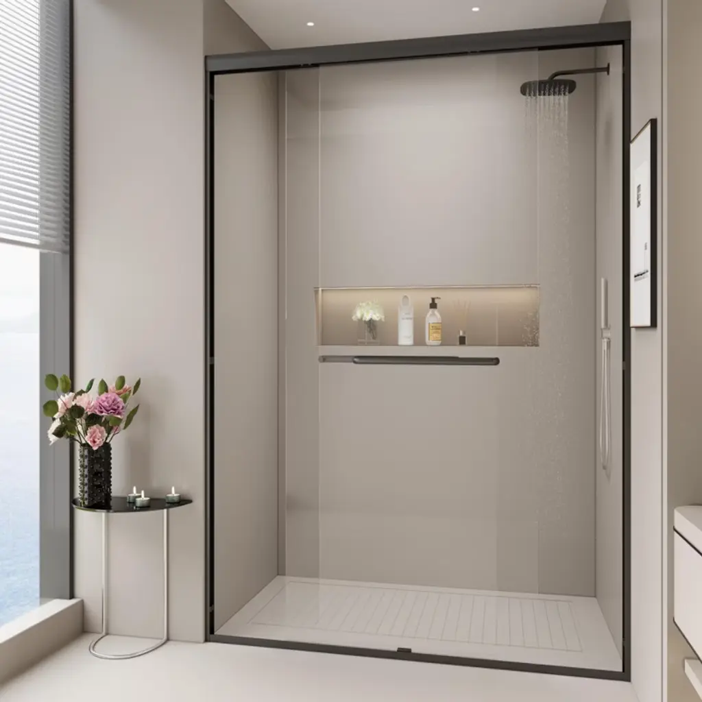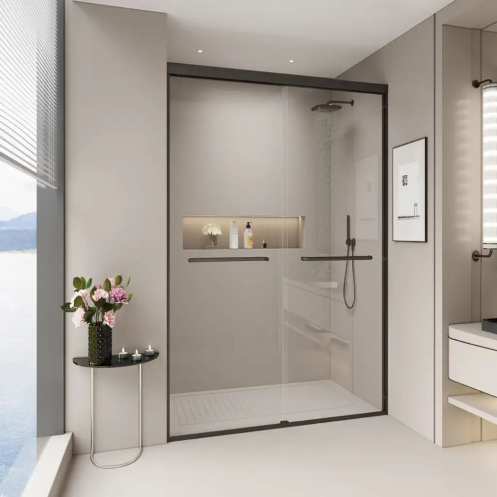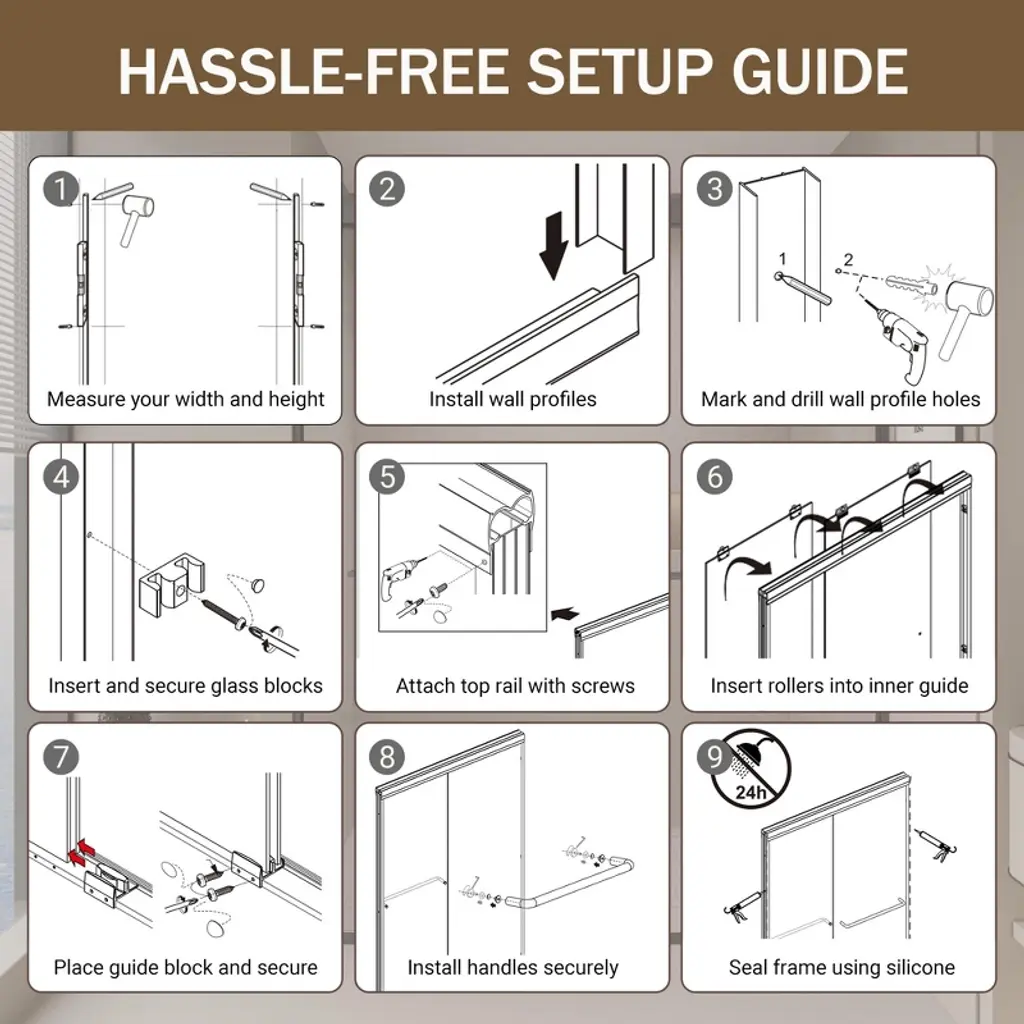 Gulches double sliding shower door delivers sleek spa style to compact bathrooms Measuring 44 to 48 inches wide and 72 inches high the semi frameless bypass unit uses two 24 inch panels that glide left or right for a wide 22 inch entry without swing space The 6 mm ANSI certified clear glass is backed with an invisible explosion proof film that keeps shards attached if impact occurs so cleanup is safe The lightweight aluminum alloy frame is finished in deep matte black and features anti collision corners that protect both glass and wall tiles Full length clear vinyl seals lock water inside while stainless steel handles offer a secure grip The top rail can be cut on site for a custom fit and the system can be installed to slide from either side Every package contains one top rail one bottom rail two glass panels four silent rollers two handles wall profiles seals screws and a step by step guide Average install time is under an hour Once mounted the door glides quietly and stays stable for years of daily use Enjoy durable elegance backed by Gulches engineering