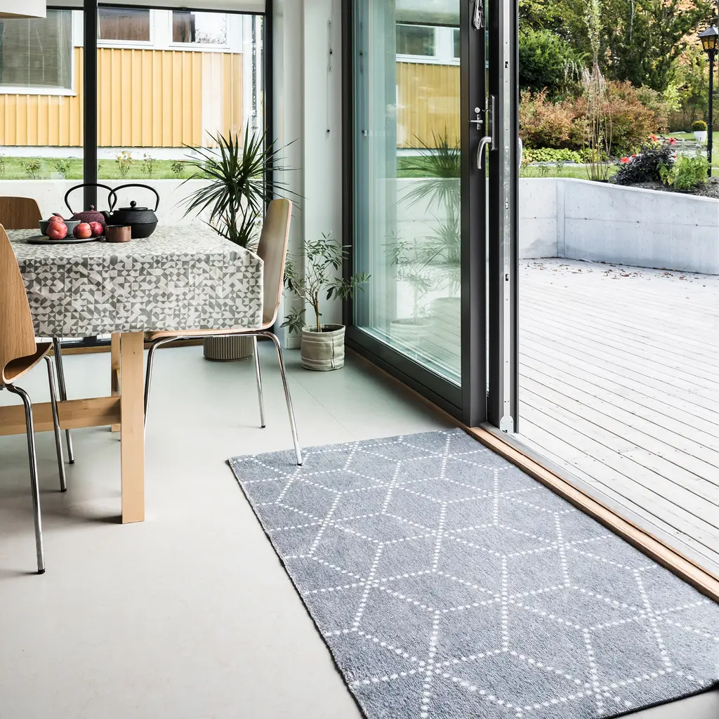 Inspired by cold, wet winters, the Hagl series provides an elegant way to keep your home dry and clean, all year round. Designer Cathrine Kristensen referenced hail and ice in the design of the Hagl doormats, with small dots creating an eye-catching geometric pattern. Made from 100% recycled PET plastic, the soft textile layer is durable and efficient at absorbing moisture and trapping dust and dirt. Additionally, a non-slip rubber backing keeps the mat in place and prevents moisture from reaching the floor. Designed and made for indoor use, the Hagl doormats offer a stylish solution to create a warm space at the entrance to your home.