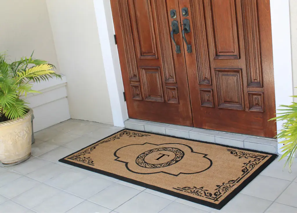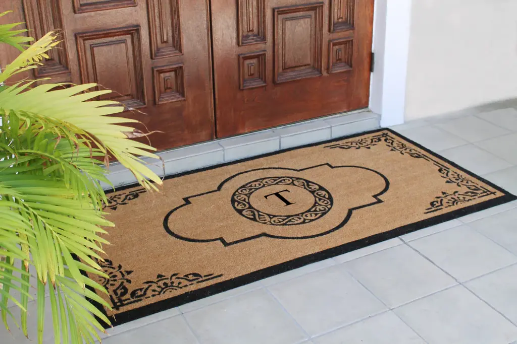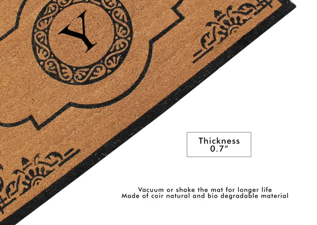 Add an excellent decorative accent to your doorway or entrance with this X-Large monogrammed doormat.Featuring all the letters of the alphabet, this mat helps remove dirt, debris and moisture from the soles of your shoes.Flexible coir bristles are robust and durable for a good scrub result. This mat provides exceptional brushing action on footwear with excellent water absorption.This doormat is X Large and covers the double door entrance perfectly.>NATURAL COIR PILE: It is made from 100% natural coir fibers which are one of the strongest fibers and they naturally trap dust and other particles, and also acts as a natural bug repellent. Initial Shredding is natural with coir mats which gets reduced with time and use.>100% VINYL BACKING: This provides an anti-slipping effect. Biodegradable mat resists mold and mildew.>ATTRACTIVE DESIGN AND ANTI SHRED TREATMENT: This is a personalized design and every mat is Hand monogrammed individually in the USA. Each mat is finally applied with anti-shred treatment which helps reduction in shredding.>OUTDOOR USE UNDER COVERED AREA: The product can be used outside under covered areas only. Do not expose directly to rain and sunlight. Can be used at any entryway/ door front. Built to last, the durable material will withstand any weather condition.>LOW MAINTENANCE: Coconut coir is naturally resistant to bacteria and fungi, making this the most low-maintenance doormat possible. It is also water-resistant, and will dry quickly so you won"™t need to worry about mildew or molds. Simply shake it out or vacuum regularly for longer life, and let the coir do the rest.>MAKES A GREAT GIFT: As the Door mats are personalized it can make a great remember able gift .>Only for use in covered outdoor areas. Do not expose directly to sunlight or rain.