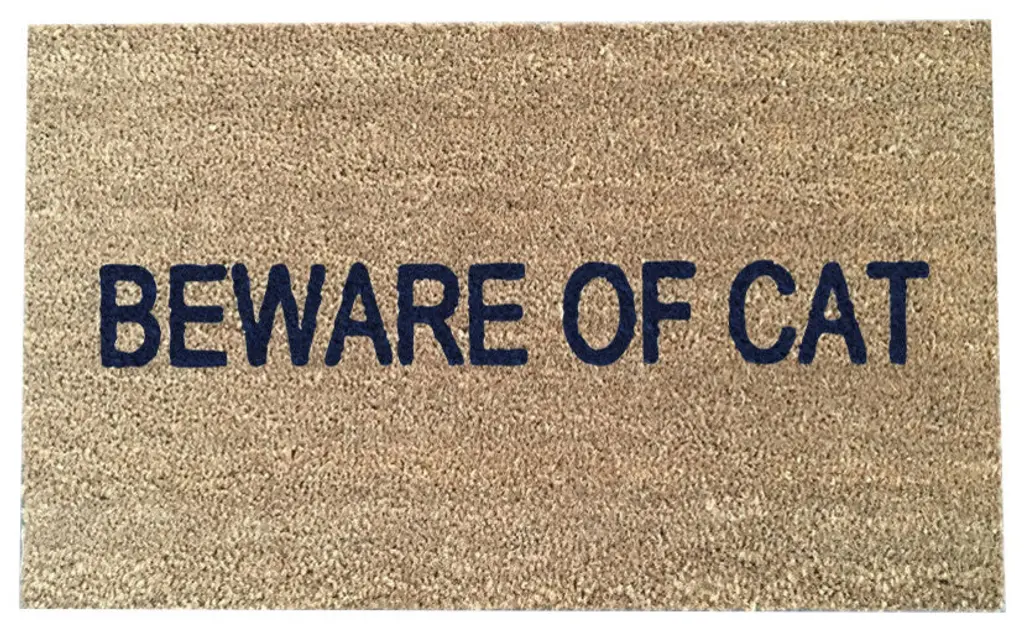 Our BEWARE OF CAT'' doormat is the perfect way to convey your style and humor to your guests! Our welcome mats are hand- painted and each design is available in a wide variety of colors. - All of our mats are tan/natural brown in color. The natural coir fibers of the doormat are from the husk of the coconut which is mold and mildew resistant and have an extra- sturdy, thick vinyl backing to ensure they wont slide around, no matter the surface. Though we use all- weather paints and a UV sealant to ensure that your mat is perfect for your doorstep, we suggest that you keep your mat as dry as possible to avoid darkening of the fibers. To clean, simply shake out...easy as that! - This product is made to order. We do our best to process and ship standard orders as quickly as possible. Please observe lead times. ! - Color Options: Black Soul, Troubled Times Gray, Bleeding Heart, Cherry Lips, Mr. Jones Orange, Lucky Charm Green, Kelly Green, Amazon Dark Green, Little Boy Blue, Sophie Sky Blue, Pacific Blue, Midnight Dark Blue, CA Bear Brown, Jelly Dark Purple